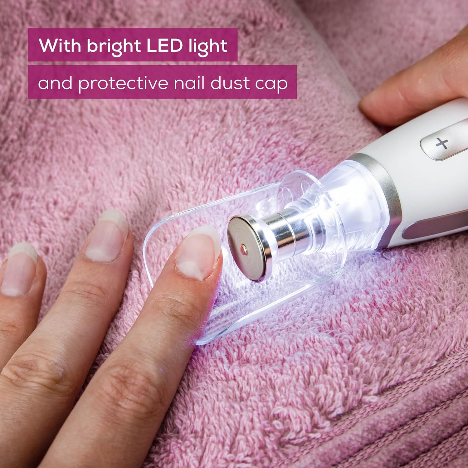 - PRECISE FILING: The integrated LED-light enables a more refined finish by illuminating the nail area – while the dust shield keeps your manicure and pedicure hygienic and mess-free