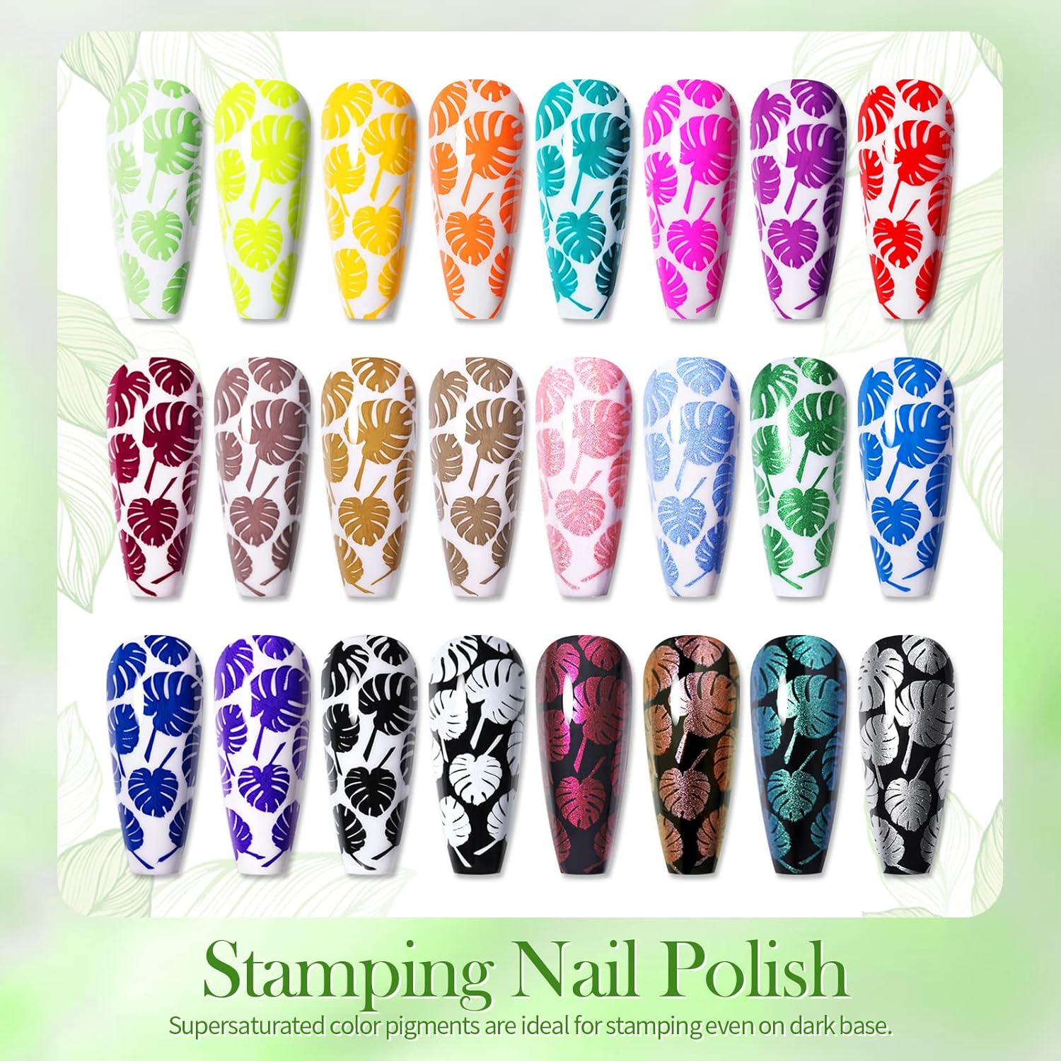 - 24 COLORS FOR YOU There are 24 colors for you to choose from and design your best nail art with.Include both pure color stamping polish,holographic stamping polish and chameleon stamping nail polish.