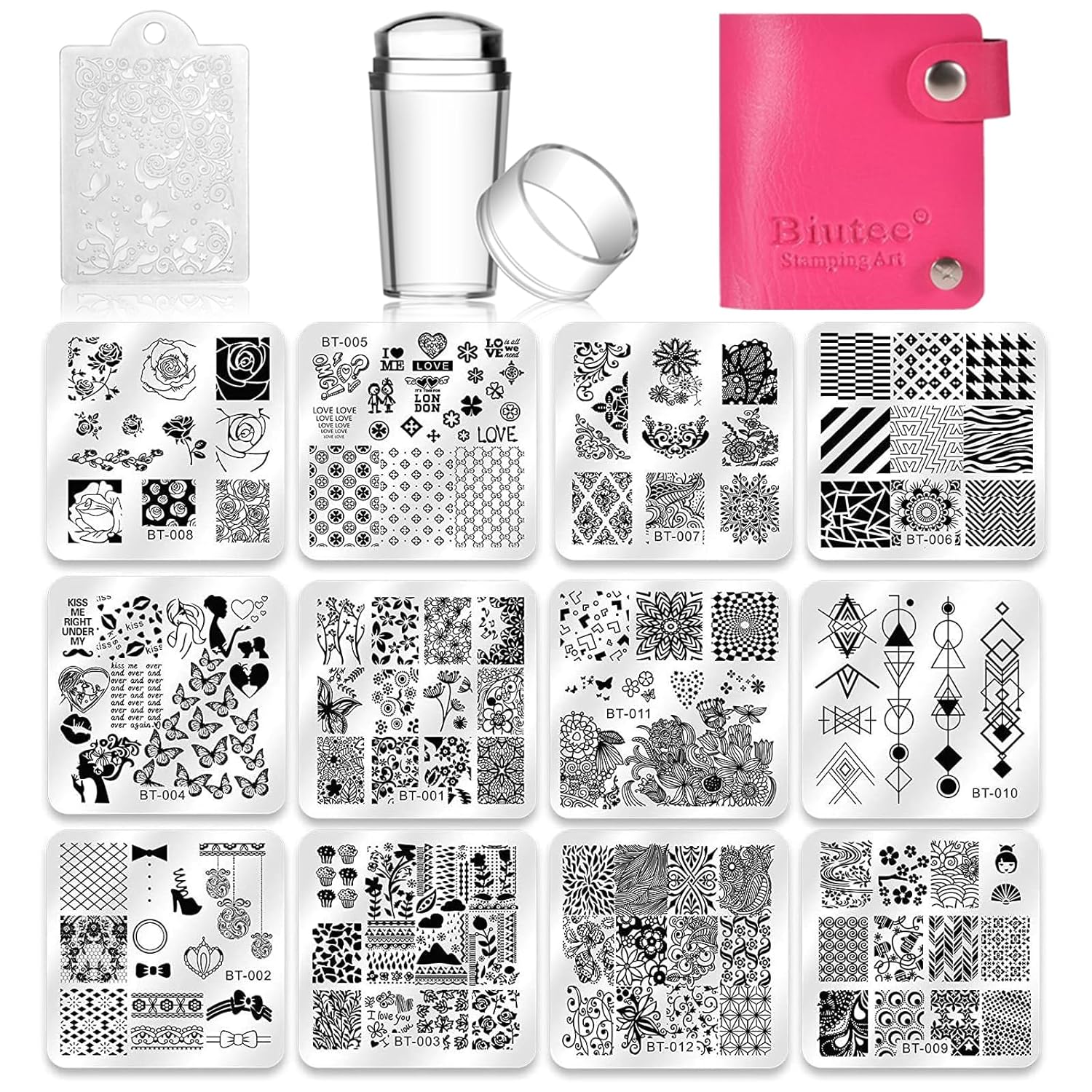 Biutee Nail Stamping Plates Set 12pcs Nail Plates 1stamper 1scraper 1storage bag Nail plate Template Image Plate Stencil Nails Tool (C)