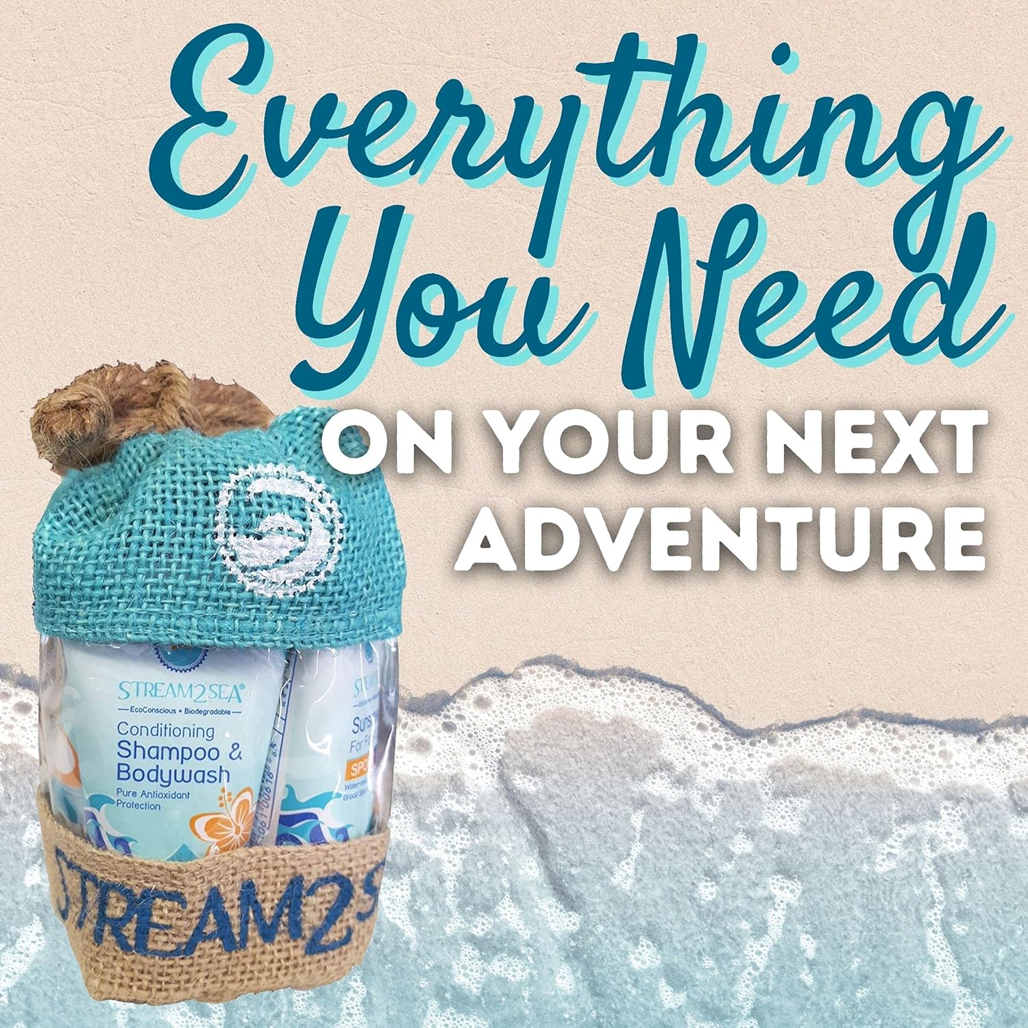 EcoConscious Travel Kit Body & Hair Care Gift Set | Shampoo & Body wash | Conditioner | SPF30, SPF20 and Mineral Sunscreen | SPF 30 Cucumber Mint and Hydrate Cherry Vanilla Lip Balm by Stream2Sea
