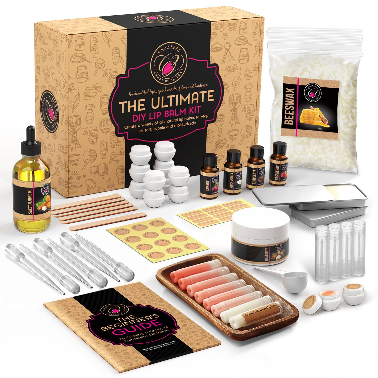 - [ ALL-IN-ONE DIY LIP BALM MAKING KIT FOR GIRLS & ADULTS ] Includes 3.5 oz beeswax, 4 oz shea butter, 4 oz sweet almond oil, 4 flavored essential oils - 5ml each (cherry, chocolate, french vanilla, raspberry), 12 plastic tubes & 12 jars with stickers, 2 tins, 6 pipettes, 6 sticks, 1 tablespoon and instruction manual, giving you everything needed to make your own moisturizing lip balm. Create a personalized lip gloss set for girls, set up a small DIY spa, or launch your own beauty venture with diy kits for adults. Ideal as a lip gloss maker or as craft kits for adults women.