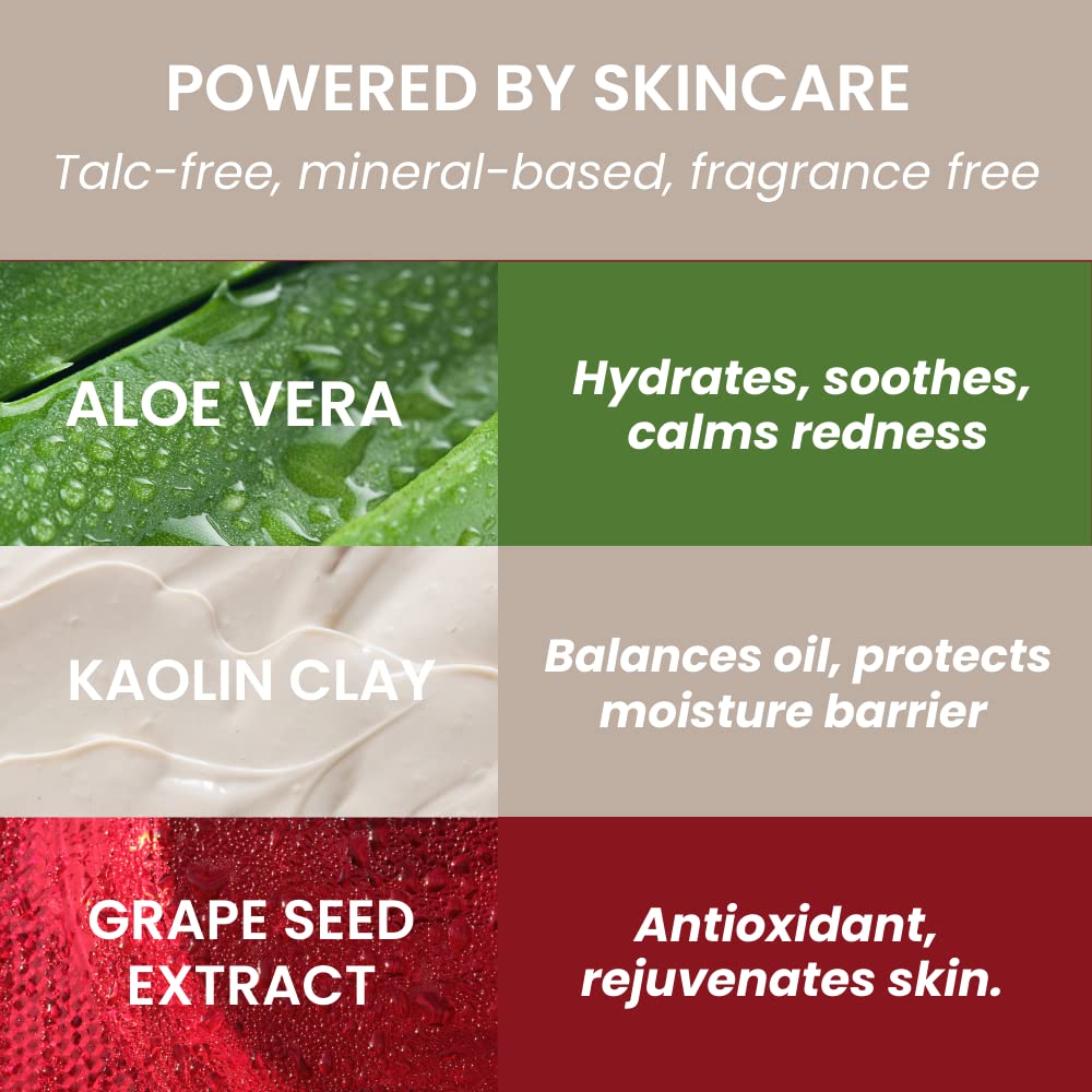 - Packed with Natural Skincare Ingredients: Ideal for all skin types, this featherweight powder features botanical extracts like skin-soothing Aloe Vera, rejuvenating Grape extract, and oil-balancing Kaolin Clay
