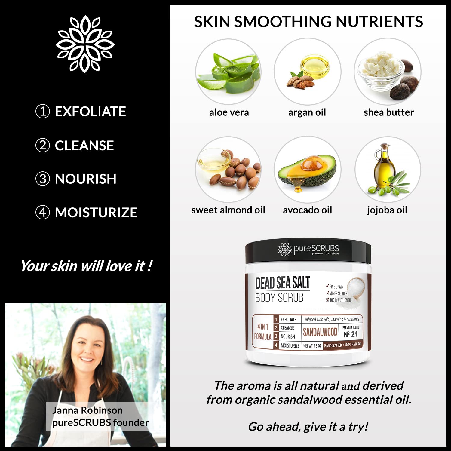 - GET ULTRA SMOOTH SKIN FAST - THIS WORKS! Our unique “4 in 1 Formula” does everything a body scrub should do and more - EXFOLIATE, CLEANSE, NOURISH & MOISTURIZE. Fine grain dead sea salt infused with essential oils, nutrients and skin softeners helps to smooth away rough, bumpy, and uneven textures to instantly reveal your true soft, healthy and radiant skin. You'll love the sandalwood aroma!