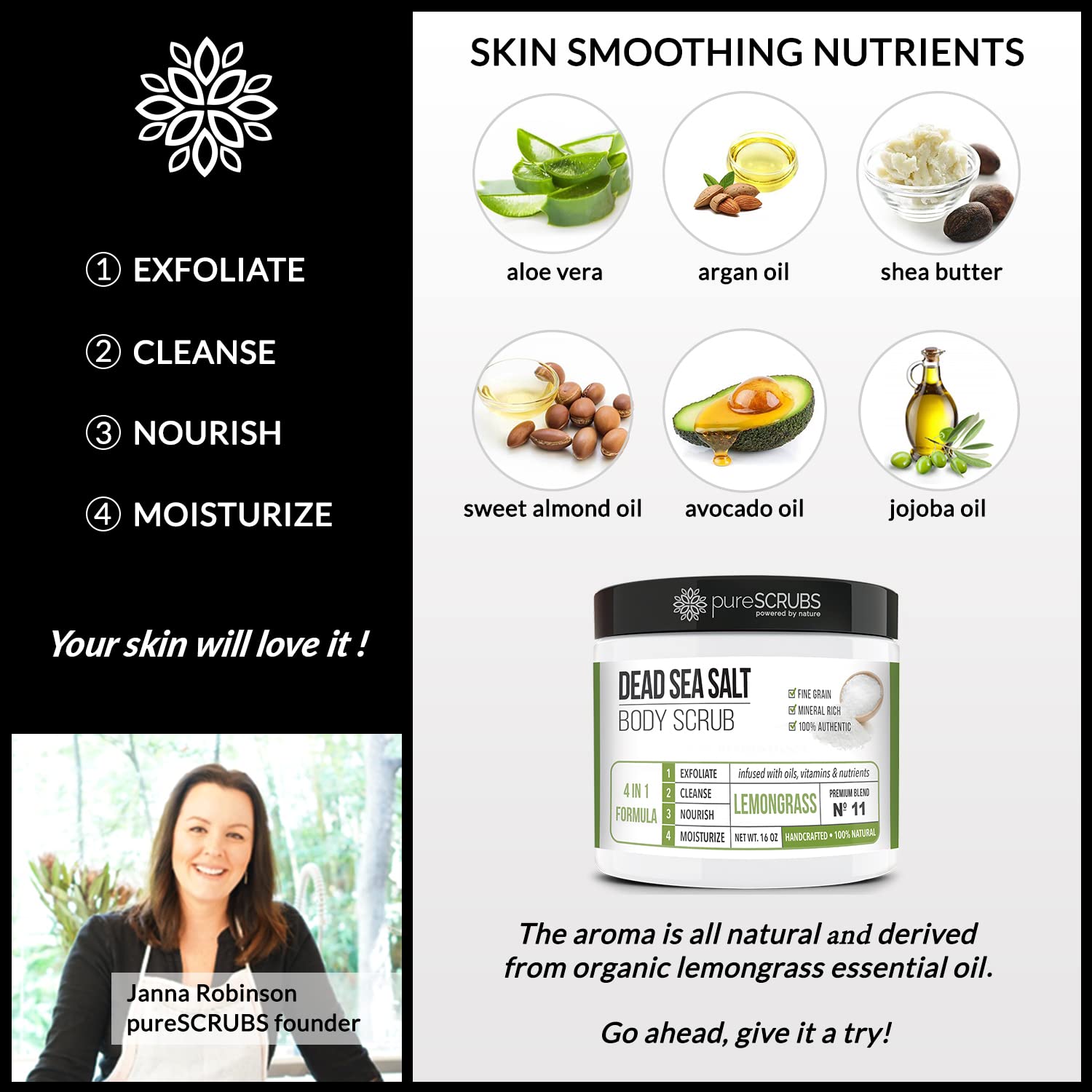 - GET ULTRA SMOOTH SKIN FAST - THIS WORKS! Our unique “4 in 1 Formula” does everything a body scrub should do and more - EXFOLIATE, CLEANSE, NOURISH & MOISTURIZE. Fine grain dead sea salt infused with essential oils, nutrients and skin softeners helps to smooth away rough, bumpy, and uneven textures to instantly reveal your true soft, healthy and radiant skin. You'll love the lemongrass aroma!