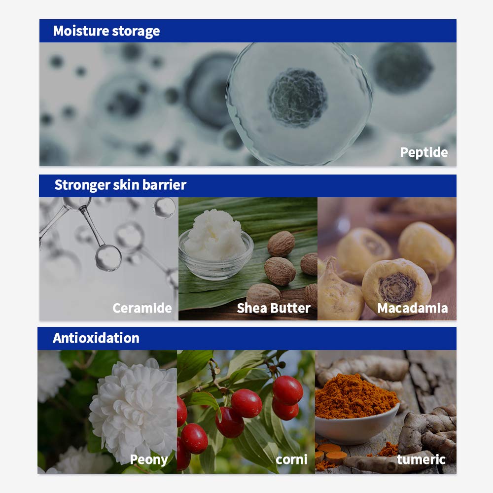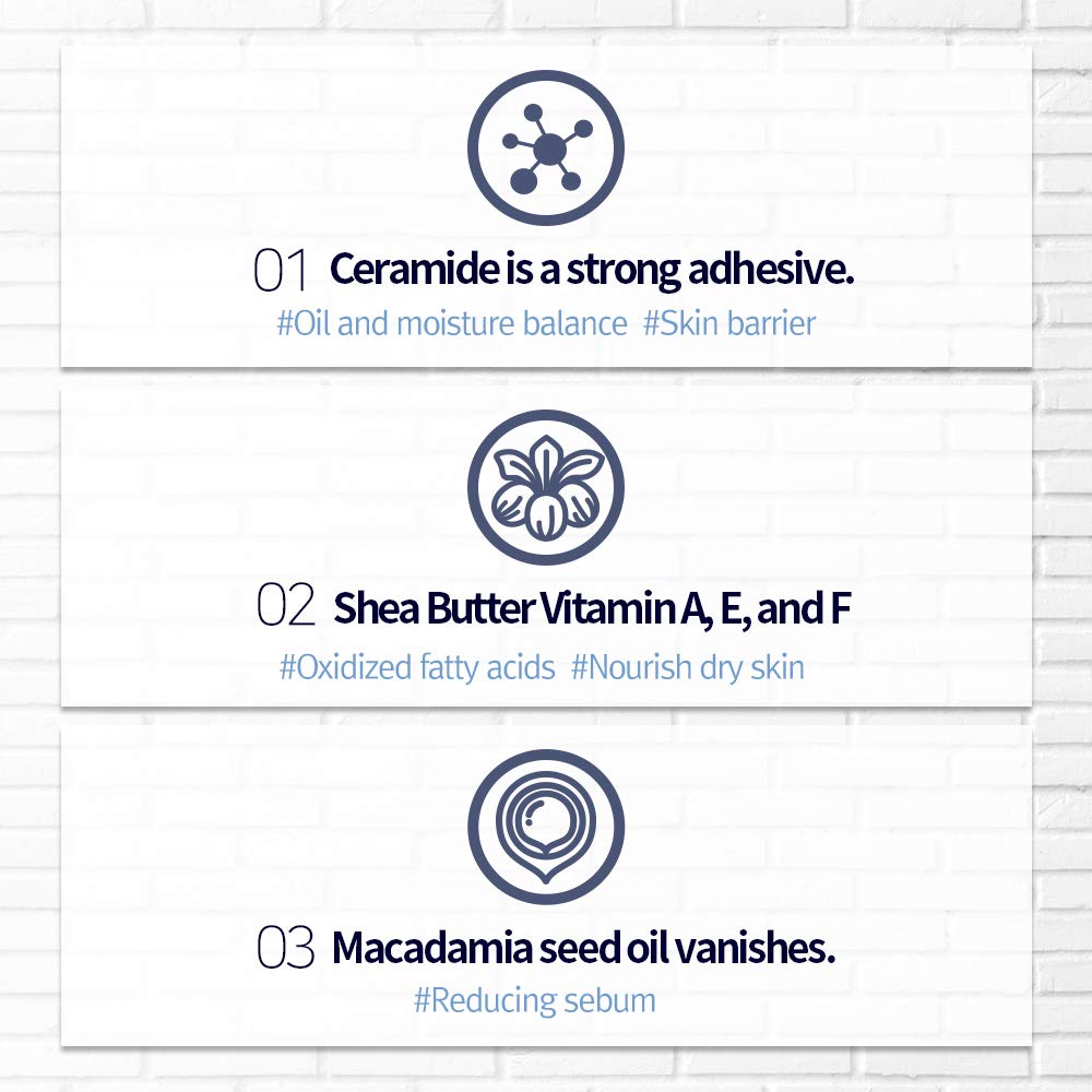 - 3-LAYER SKIN BARRIER - Ceramide in the cream plays the role of mortar which prevents moisture evaporation, adjusting oil and moisture balance properly while reinforcing an imbalanced skin barrier. Moreover, Shea Butter and Macadamia seed oil nurishes dry skin and reduce sebum resulting from aging skin.