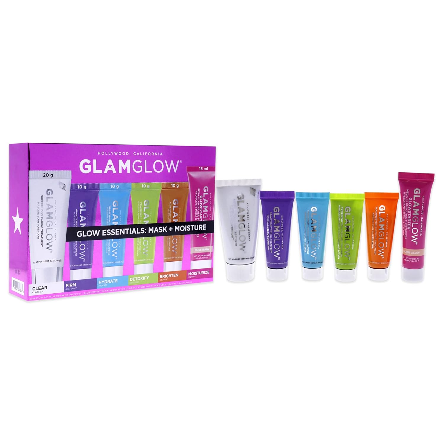 GLAMGLOW Glow Essentials Mask + Moisture Travel Set - SUPERMUD (0.7 oz), GLOWSTARTER NUDE (0.5 oz), GRAVITYMUD (0.35 oz), THRISTYMUD (0.35 oz), POWERMUD (0.35 oz) & FLASHMUD (0.35 oz)