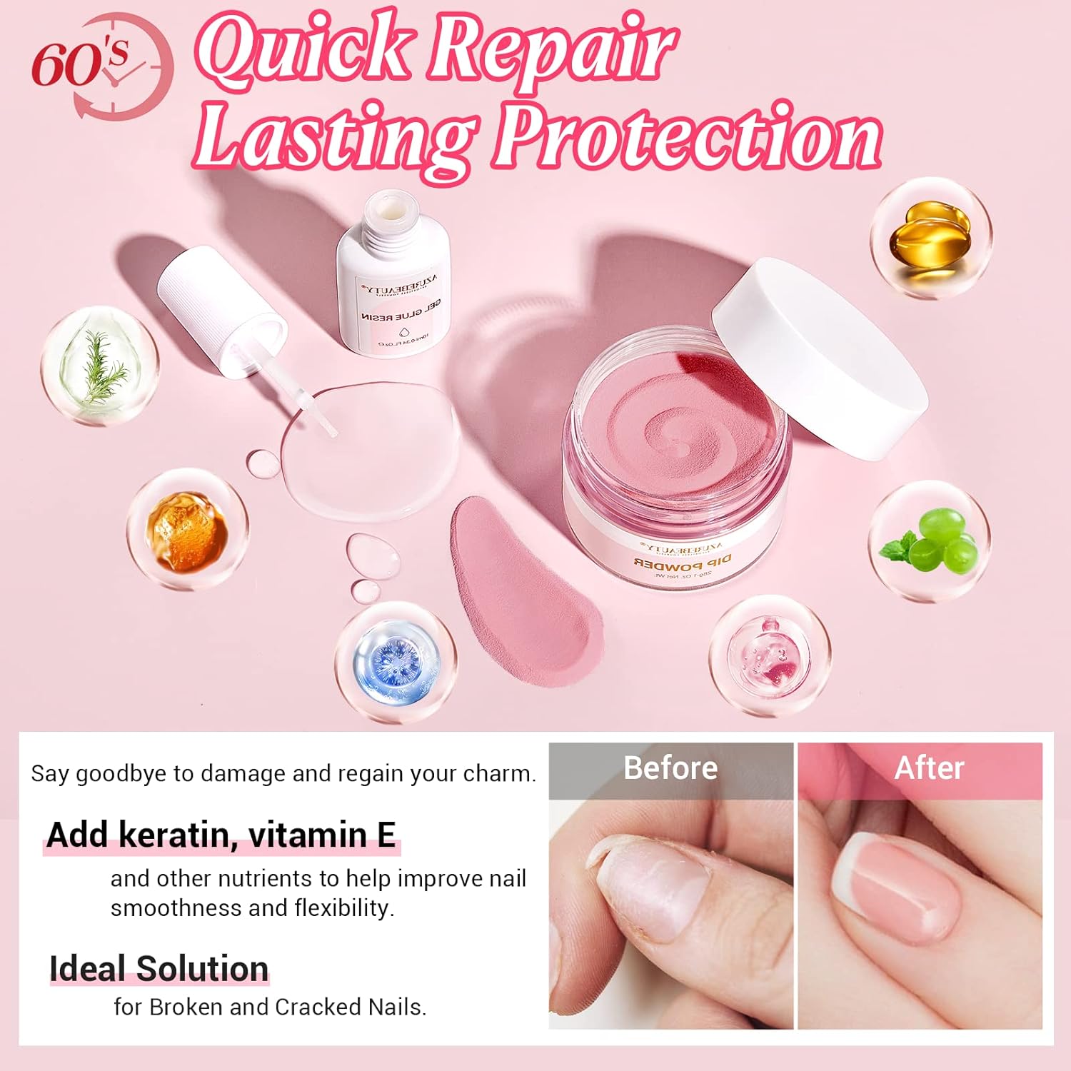 - 【What You Get】Comprehensive Nail Care Kit portable nail repair kit comes with 1*Jelly Pink Dip Powder(1 Oz/28g), 1*Quick-Drying Repair Glue(10ml), 1*Nail File, 1*Nail Buffer. To repair broken and cracked nail tips, AZUREBEAUTY provides a perfect solution for you! Say goodbye to split and weak nails