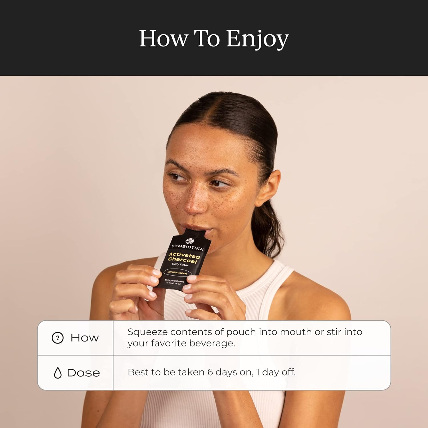 - HOW TO ENJOY: Best to be taken 6 days on, one day off. Squeeze contents of pouch into mouth, or stir into your favorite beverage. Store in a cool, dark place or refrigerate after opening. Do not freeze. Includes 26 pouches per container.