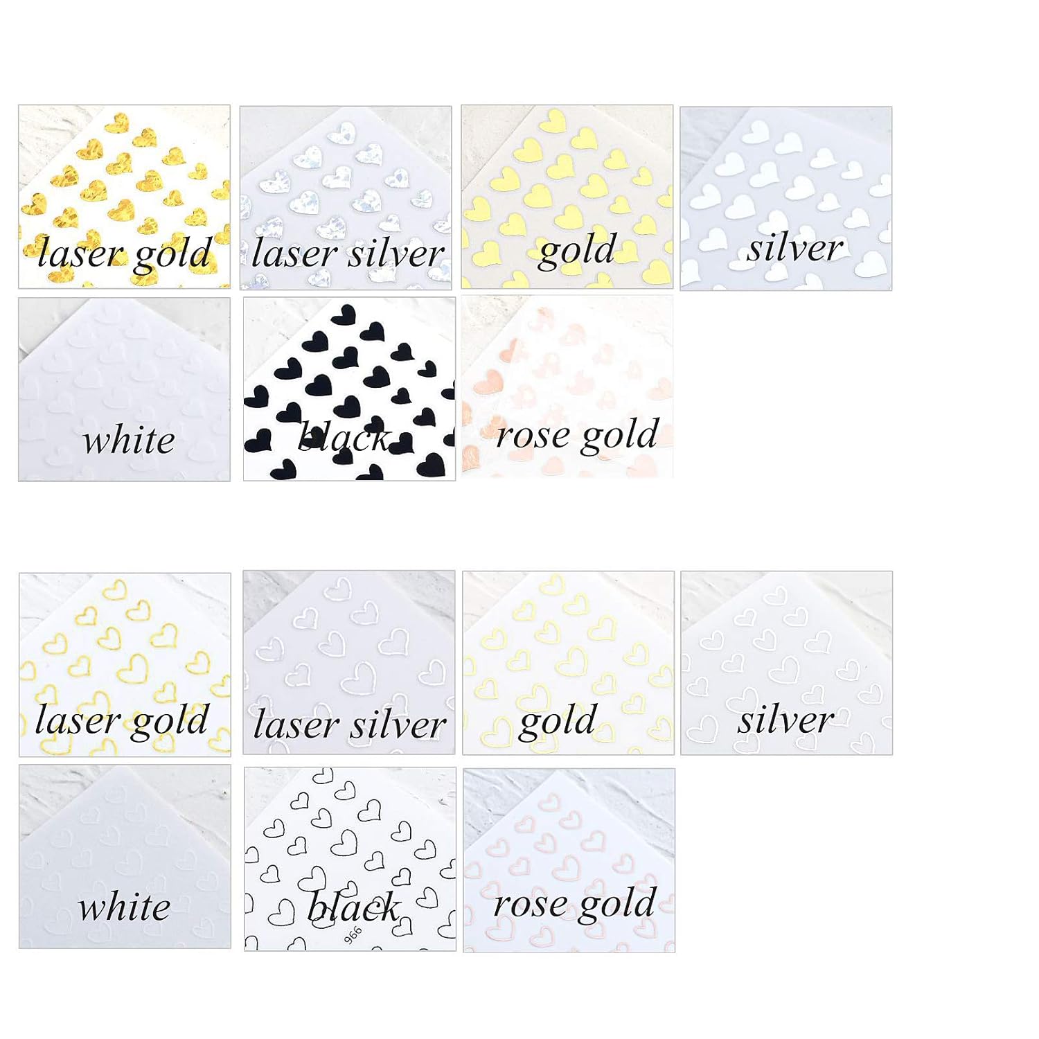 - There are two kinds of heart designs - solid heart shape and hallow out heart shape. Each design has 7 different colors - black, white, gold, silver, rose gold, laser gold and laser silver. Besides, there is also a sheet of red heart nail stickers.
