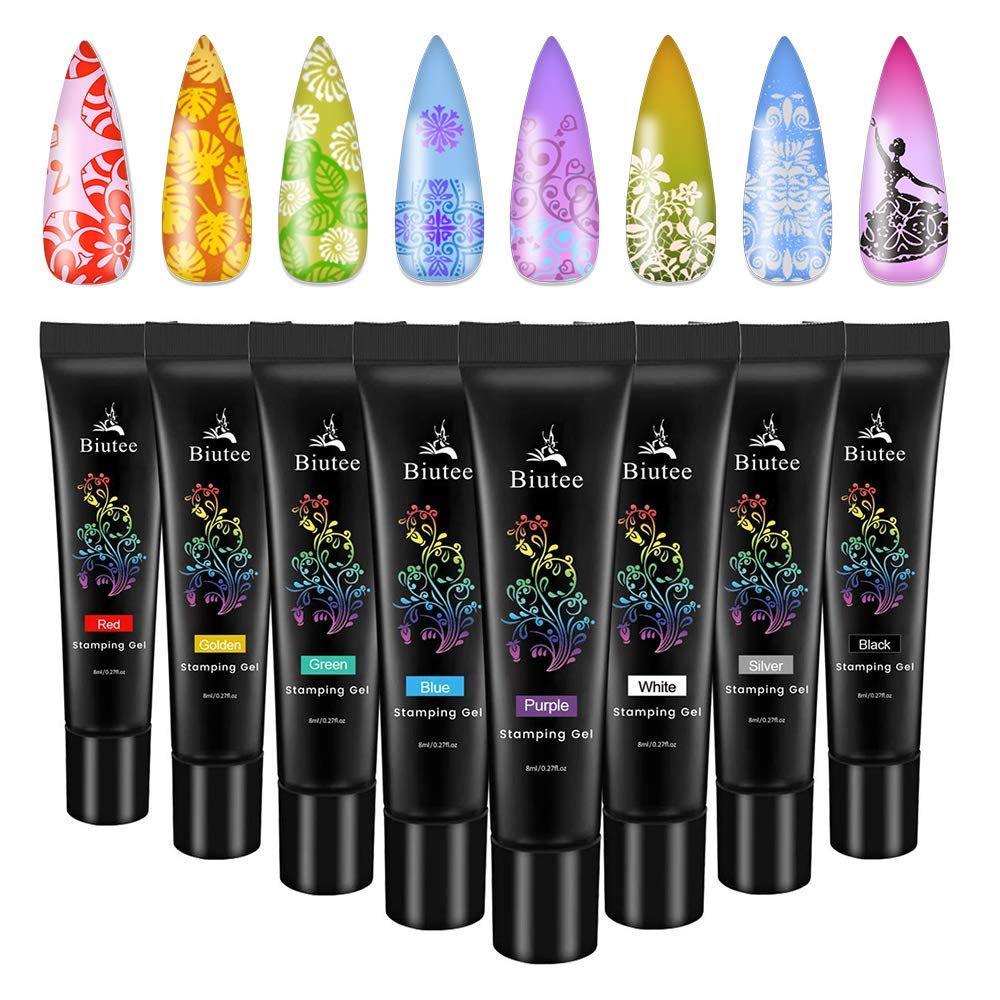 - 【Biutee Stamping polish gel】 This package includes 8*8ml nail art stamping gels with different colors (Black, White, Blue, Gold, Green, Purple, Red, Silver).Each color will meet with different patterns,it also can improve your DIY skill.