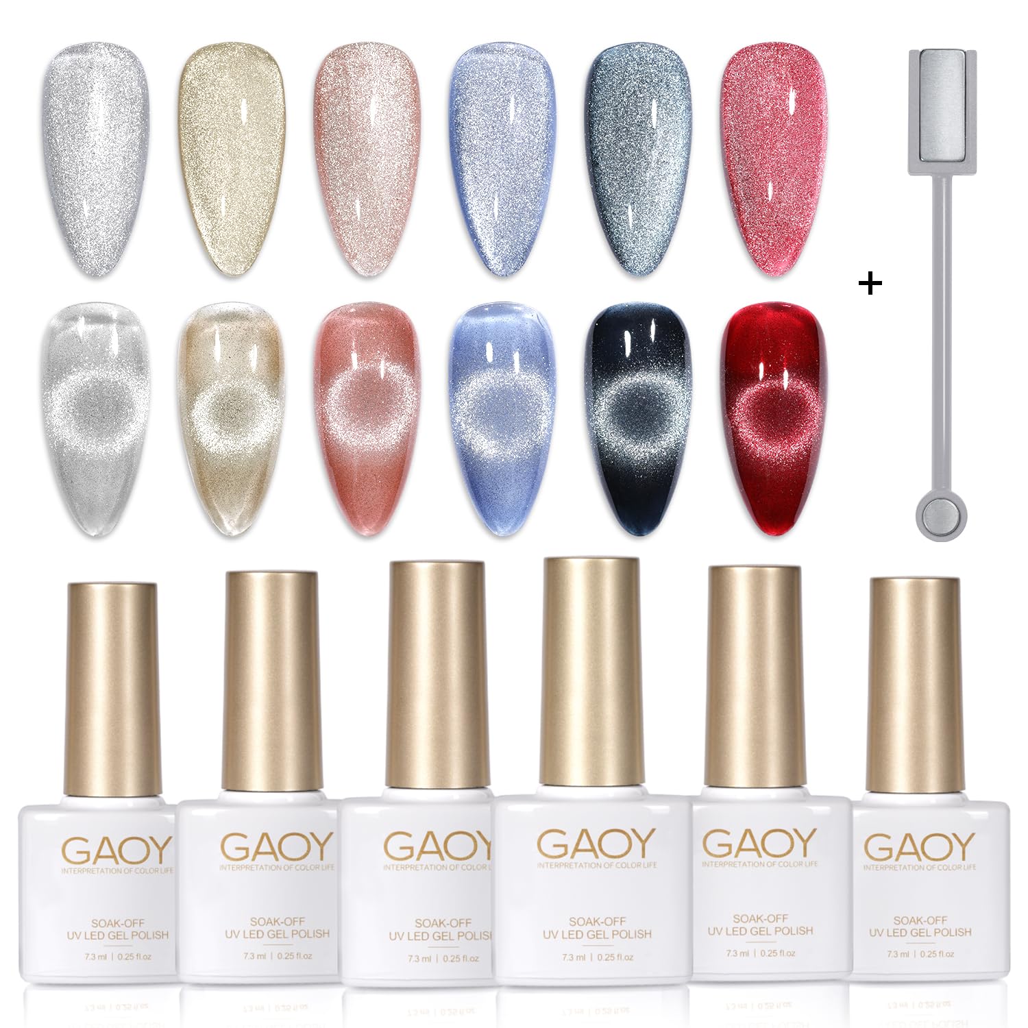 - Package Includes: 6 gel polish colors of 0.25 fl.oz (7.3ml) each + cat eye magnet. Professional gel nail set to enjoy the nail art from the comfort of your own home!