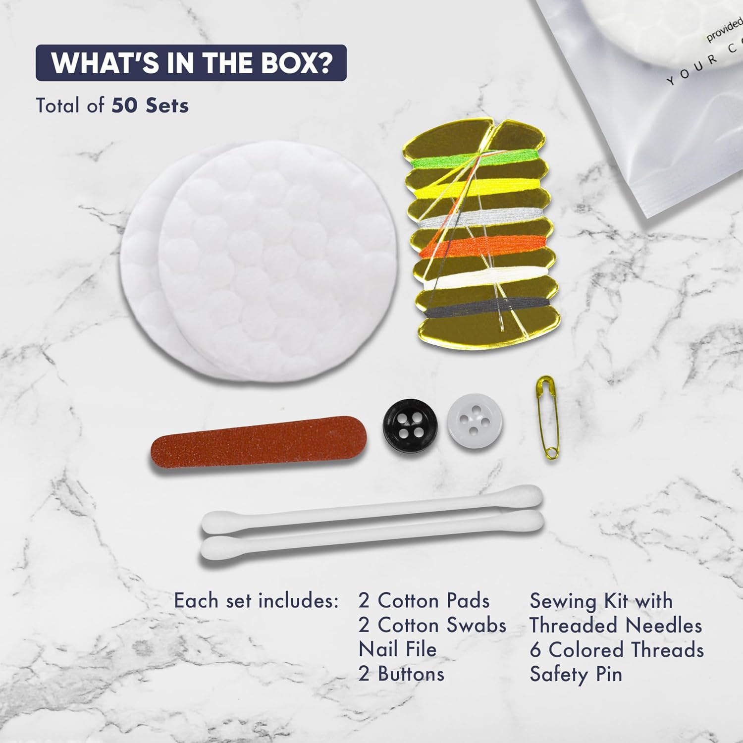 - INCLUDES: Hospitality Size Generic Personal Care Kit 2 Cotton Pads, 2 Cotton Swabs, Nail File And Sewing Kit With 2 Threaded Needles, 4 Color Thread, Safety Pin And 2 Buttons
