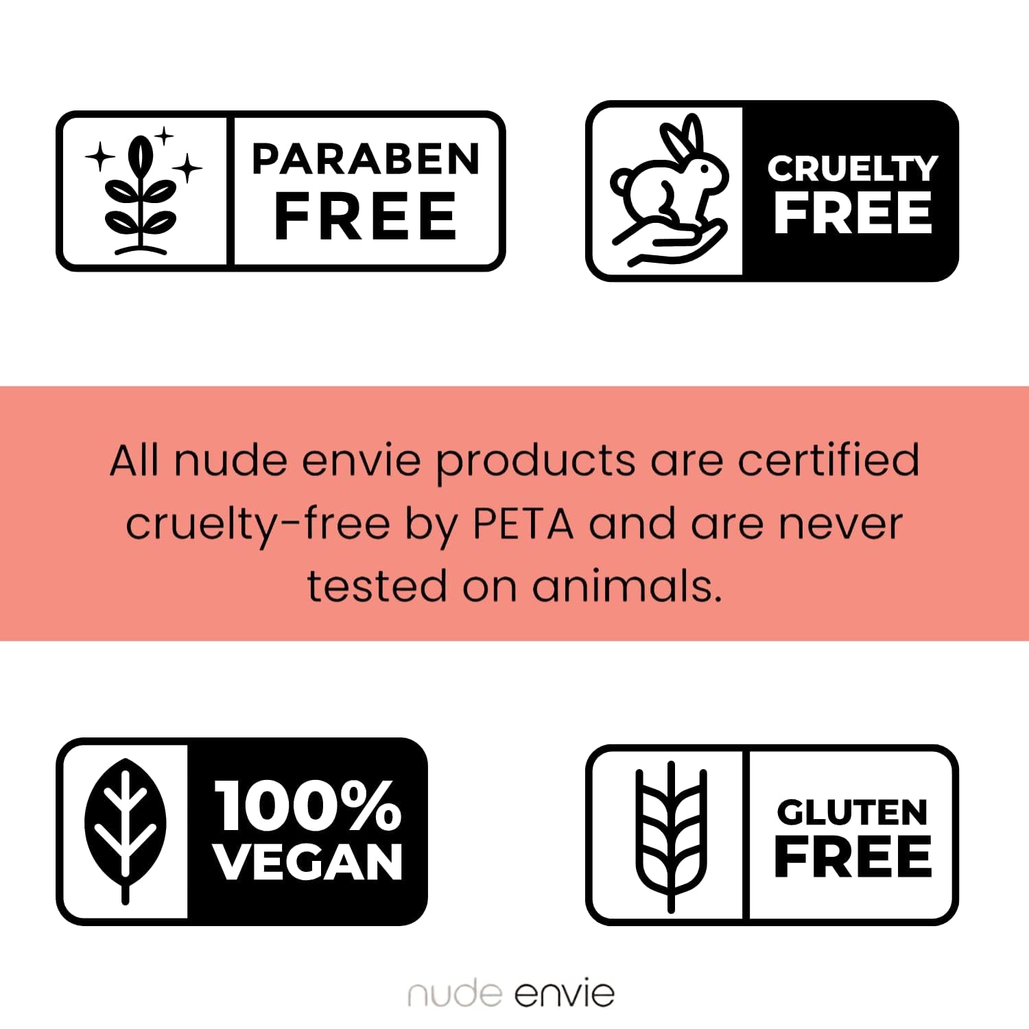 - Certified Vegan, Cruelty-Free, and Paraben Free- Nude Envie is carefully crafted using the finest ingredients. All products are certified vegan, cruelty-free, paraben-free, and gluten-free.