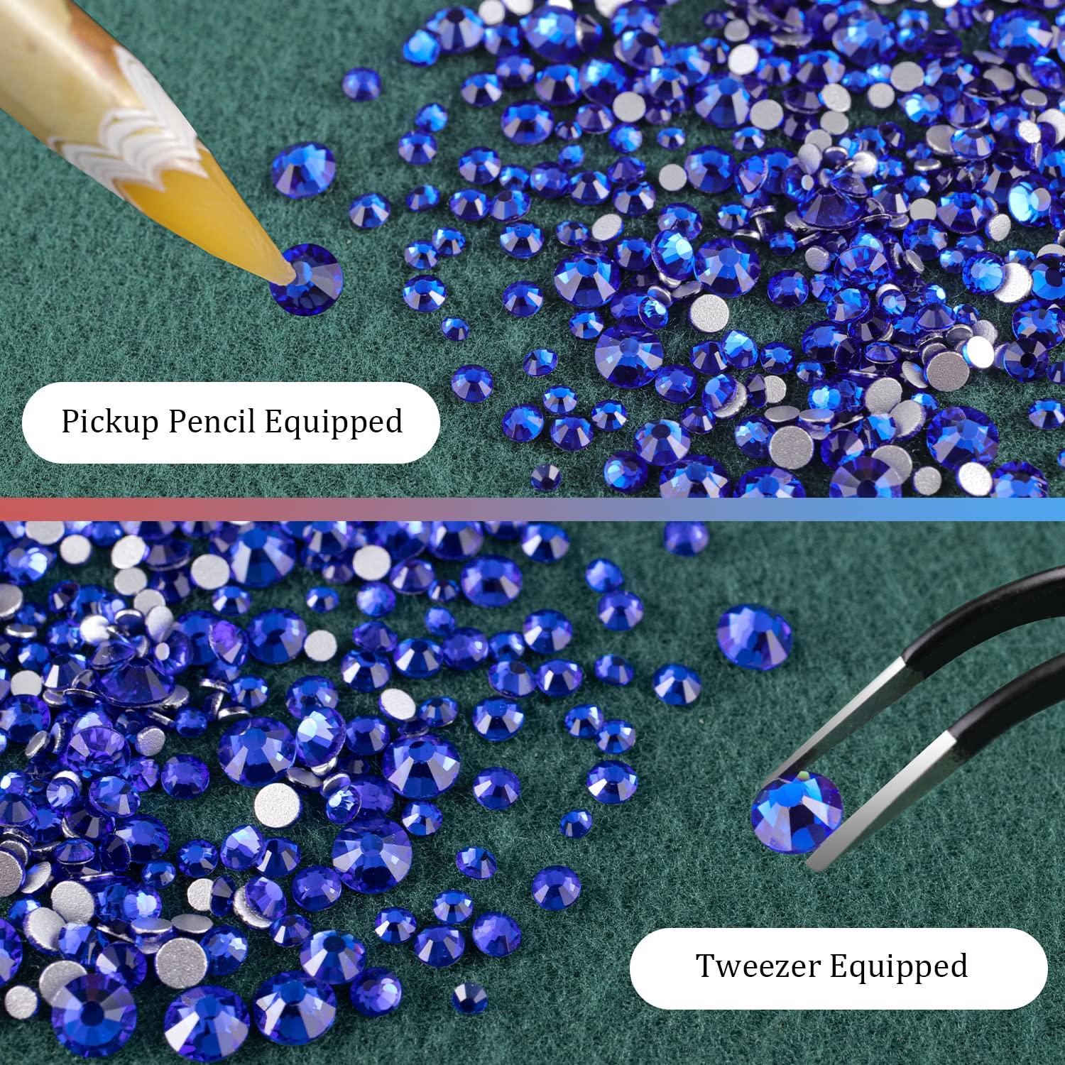 6 Sizes Royal Blue Glass Crystal Kit with Pickup Pen + Tweezer Tools for Shine Nail Art Manicure Makeup DIY Decoration Flatback Round Rhinestone Gem Jewelry Diamond