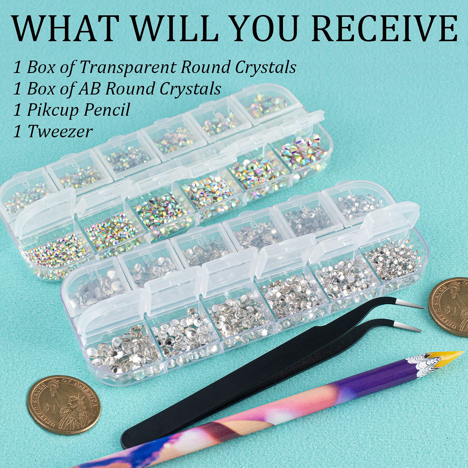 - ❤WHAT YOU WILL RECEIVE -- 1 Box of 6 Sizes Transparent White Round Glass Nail Crystal Rhinestones Beads (Totally About 1720 PCS); 1 Box of 6 Sizes AB Round Glass Nail Crystal Rhinestones Beads (Totally About 1720 PCS); 1 PCS Rhinestone Picker Pencil; 1 PCS Tweezer. The Well Equipped Rhinestone Set Is Suitable for Both Professional Nail Technician and Inexperienced Starter for Nail Art.