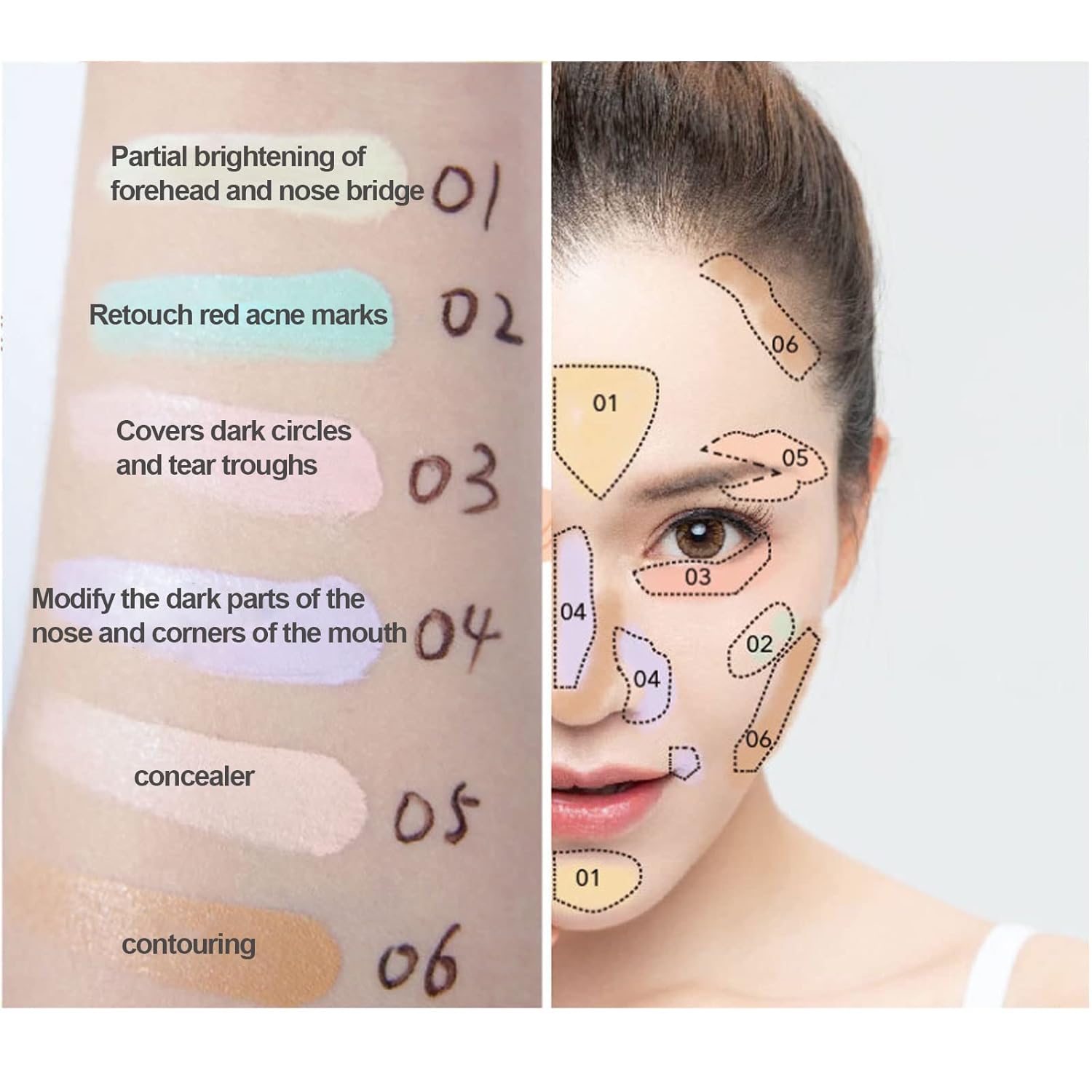 - 6 In 1 Concealer Kit: The portable concealer contour palette includes 6 colors. The 6 colors can be mixed or used in a single color. The darker shades are ideal for shading and defining, while the lighter shades are perfect for sculpting and enhancing features