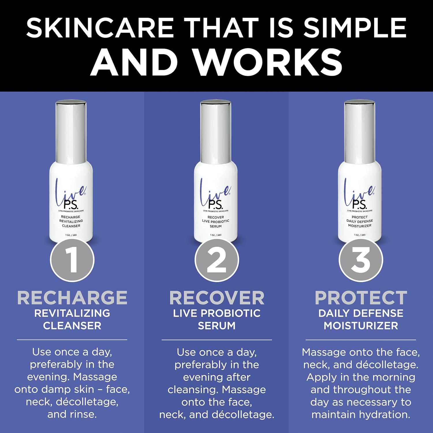 - UNIQUE 3-STEP SYSTEM: Experience our Live P.S. 3-Step Kit, a synergistic blend of a face cleanser, enriching serum, and hydrating moisturizer. Infused with plant-based ingredients and live probiotics, our products cater to all skin types, promoting a youthful, radiant complexion. Whether you have oily, dry, combination, or sensitive skin, our products aim to enhance your skin's natural beauty.
