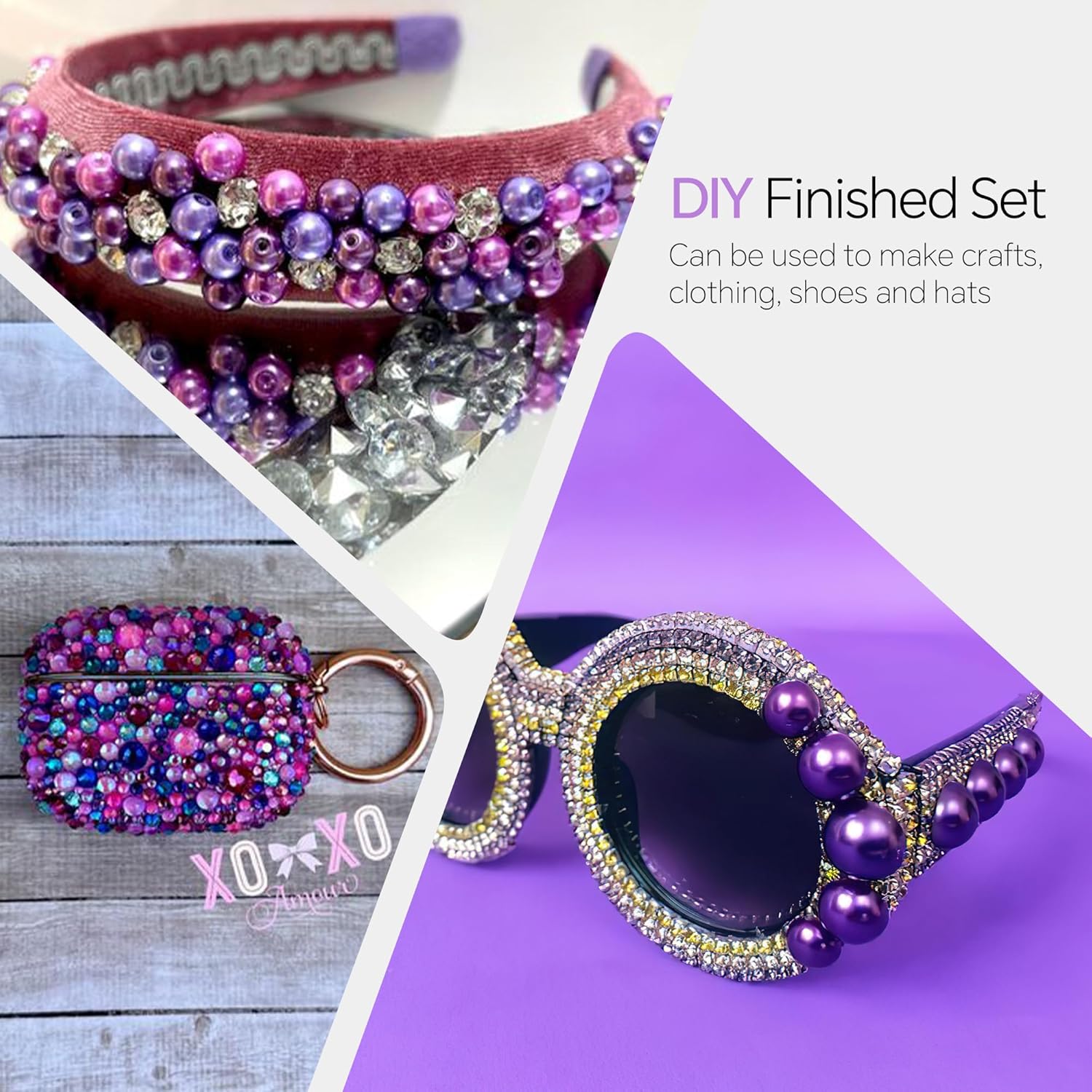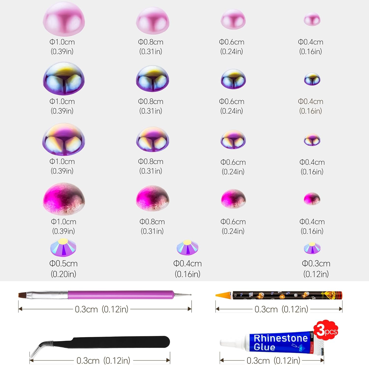 60g Purple Flat Back Pearls Rhinestones for Crafts Mixed Size 3mm-10mm AB Color Round Half Pearls Flatback Pearl Beads and Resin Rhinestones Set for Face Art with Gel