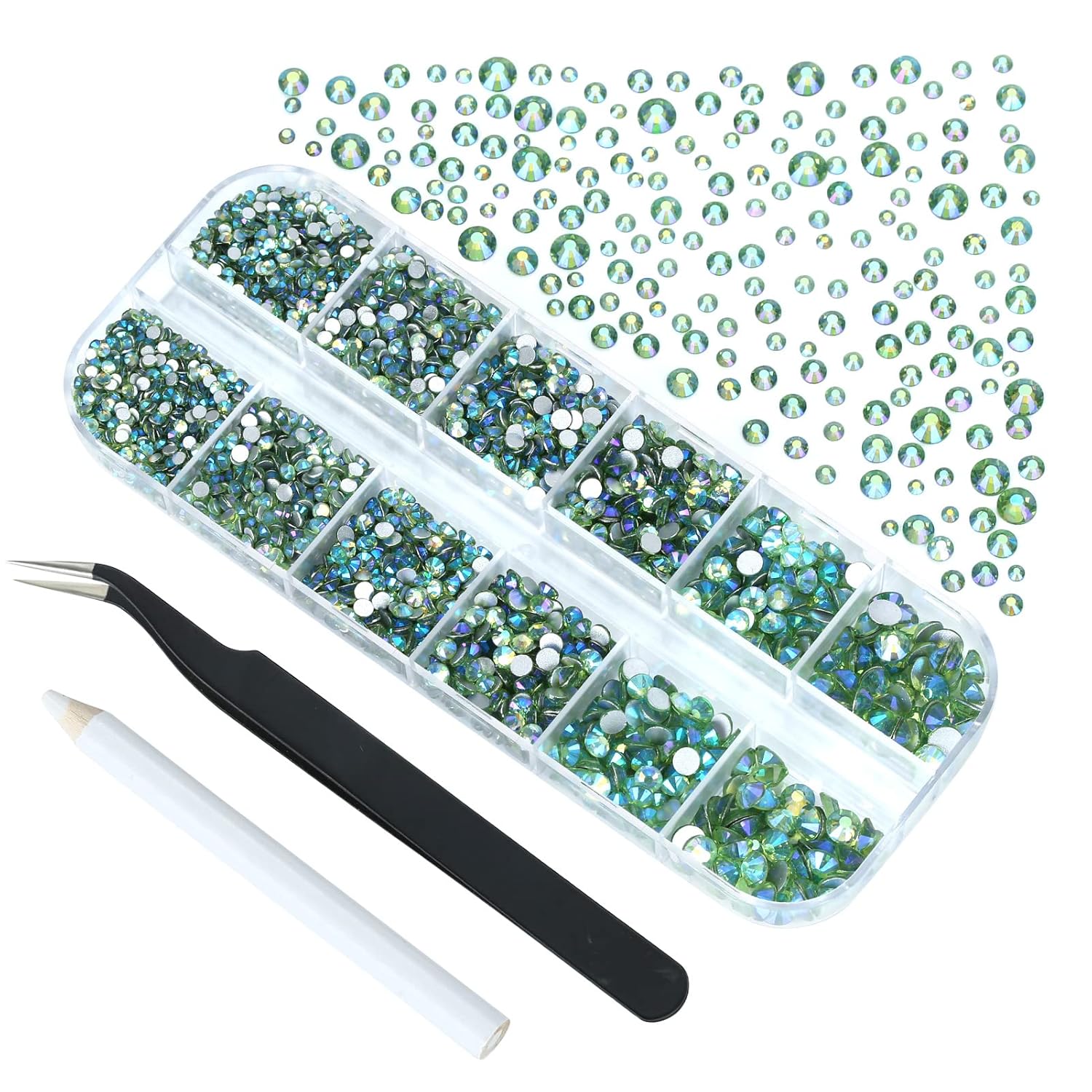 4240Pcs Light Green AB Flatback Rhinestones 6 Sizes Crystal Diamonds for Nail Art Crafts Clothes Shoes with Tweezers and Picking Pen