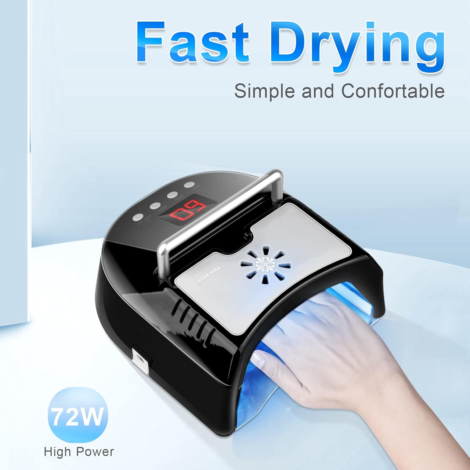 - 【72W High Power & 2X Cure Faster】 The strong power 72W UV LED lamp for gel nails come with UV+LED dual light sources,your average curing time is shortened by 50% than the traditional photo-therapy lamp. Save curing time and enhance the nail art experience for you and your customers.