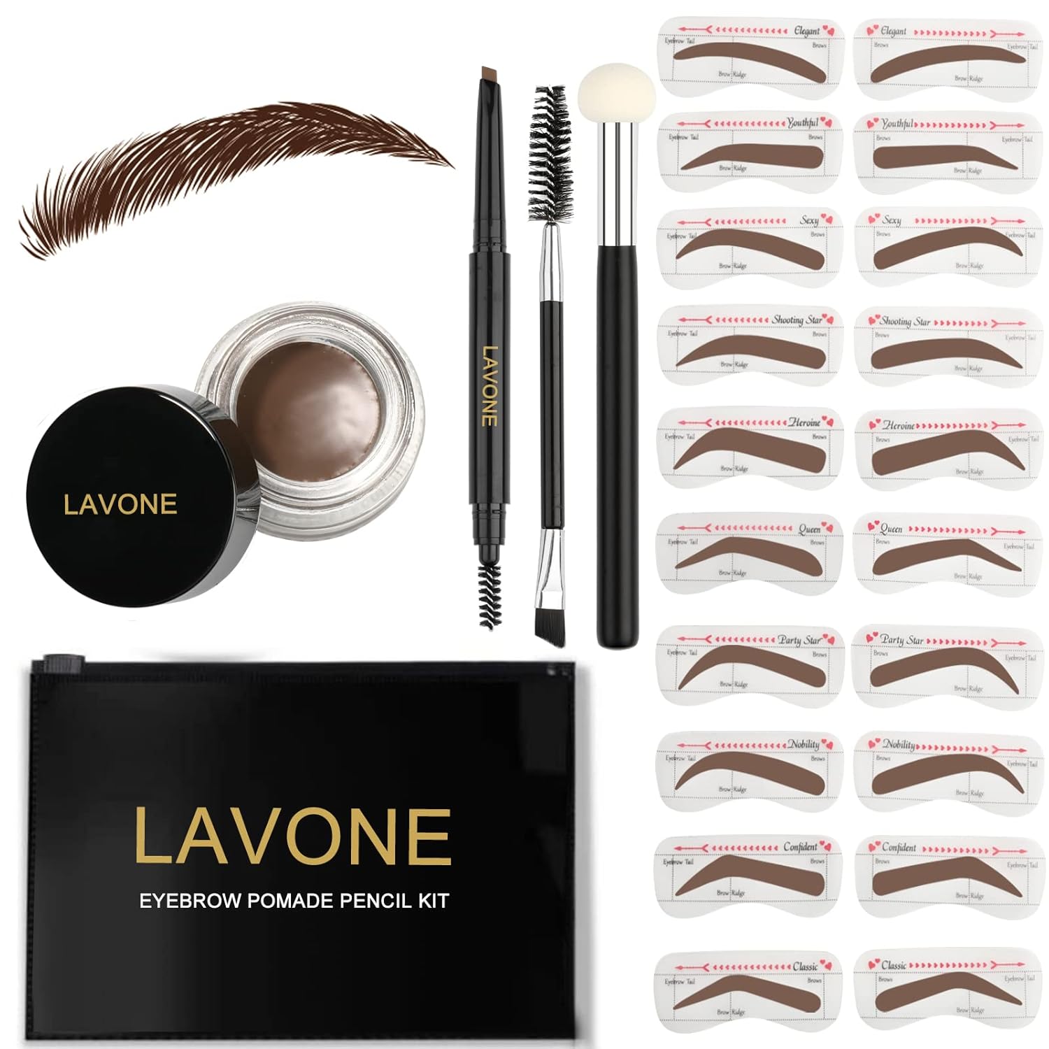 - [What’s in the eyebrow kit]: LAVONE makeup eyebrow kit includes brow pencil (dark brown), eyebrow powder(dark brown), 20 eyebrow stencils (10 different shapes), a sponge applicator, a dual precision brush and a zipper pouch for on the go.