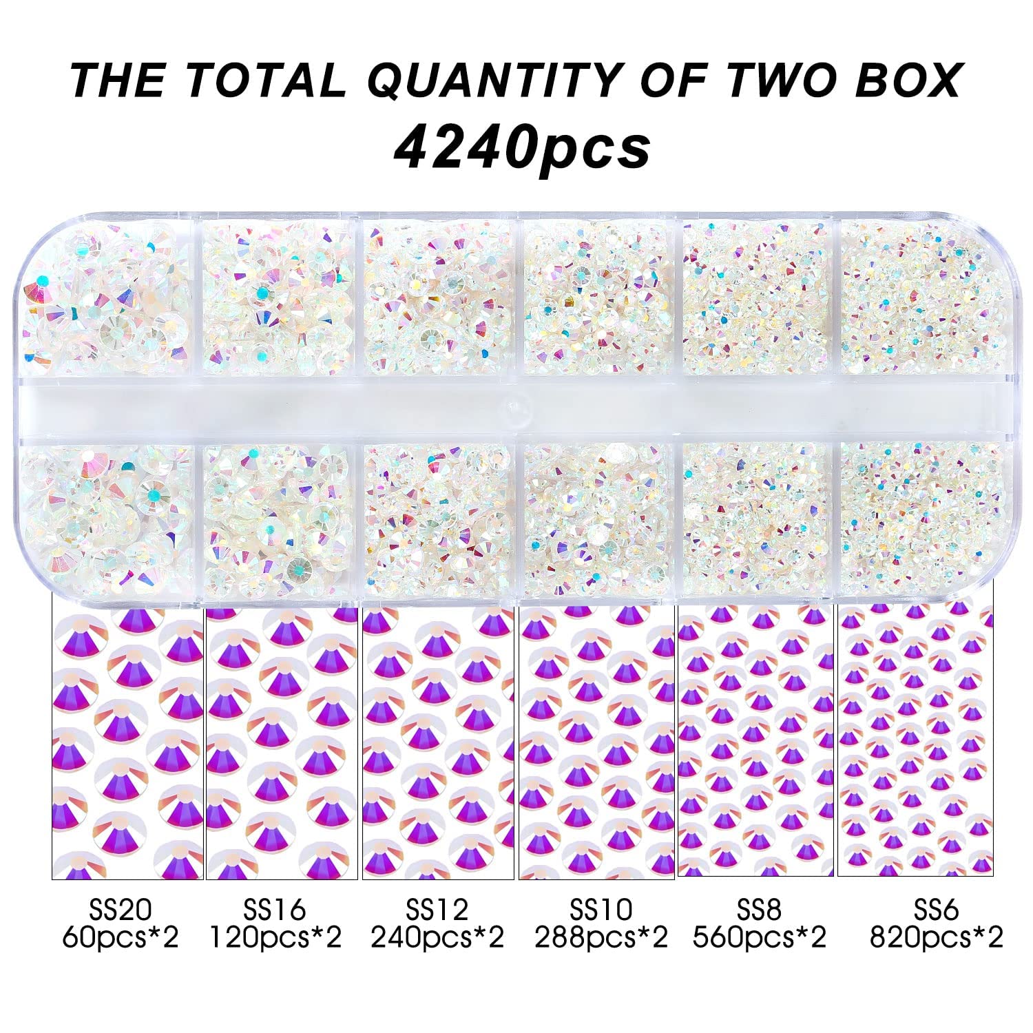 - 💎Product Packaging: Box Packaging SS6 2MM - 1680 Pcs, SS8 2.4MM - 1120 Pcs, SS10 2.8MM - 600 Pcs, SS12 3MM - 480 Pcs, SS16 4MM - 240 Pcs, SS20 4.8MM - 120 Pcs, 1 pcs Tweezers and 1 pcs Picking Pen.