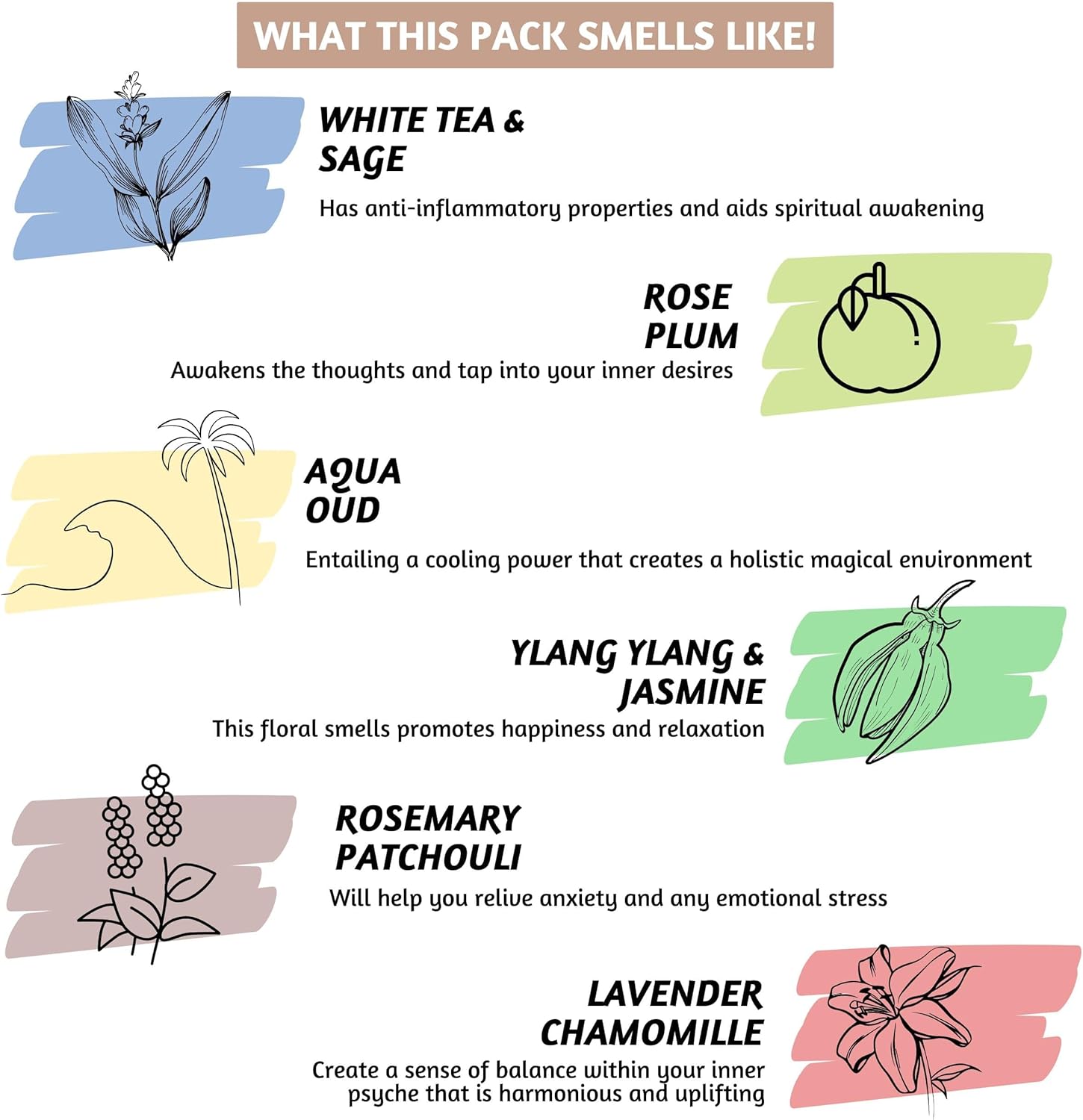 - Fragrance Note - This insence pack has a beautiful blend of mellow and relaxing fragrances such as white tea & sage incense, rose plum, aqua oud incense, ylang ylang 7 jasmine incense, rosemary incense, patchouli incense, lavender incense & chamomile incense. Be it in the meditation room, or bed room these incessant sticks impart an aromatic scent and a sense of calm.