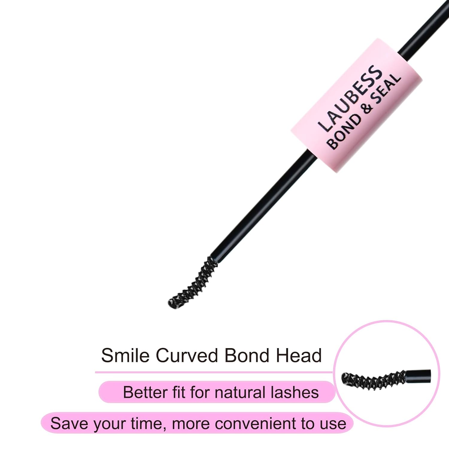 - 2 IN 1 Lash Bond and Seal: Double-ended lash glue, one side is eyelash glue, with a spiral mini mascara brush CURVED head that helps apply glue more evenly, as easy as applying mascara. The other side is the lash seal, which helps to form a protective layer on the grafted lashes and effectively improves the adhesion of the bond, making the lashes maintain longer retention.