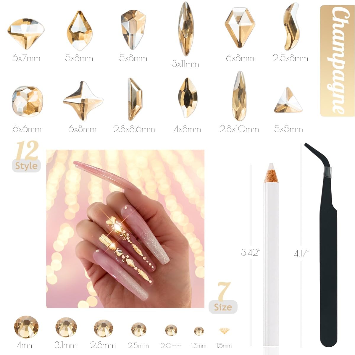 - ❤【Multi-Functions Diamonds Rhinestones & Available Occasions】Champagne Gold nail rhinestones and gems set are very suitable for Wowen: 3D nail art, flat nail art,, DIY slime making, night out, costumes, wedding dress, , Christmas decorations, gift-wrap, ornaments, ceramics, greeting cards, signs, face, nails, computer, cell phone case, invitation card and etc.