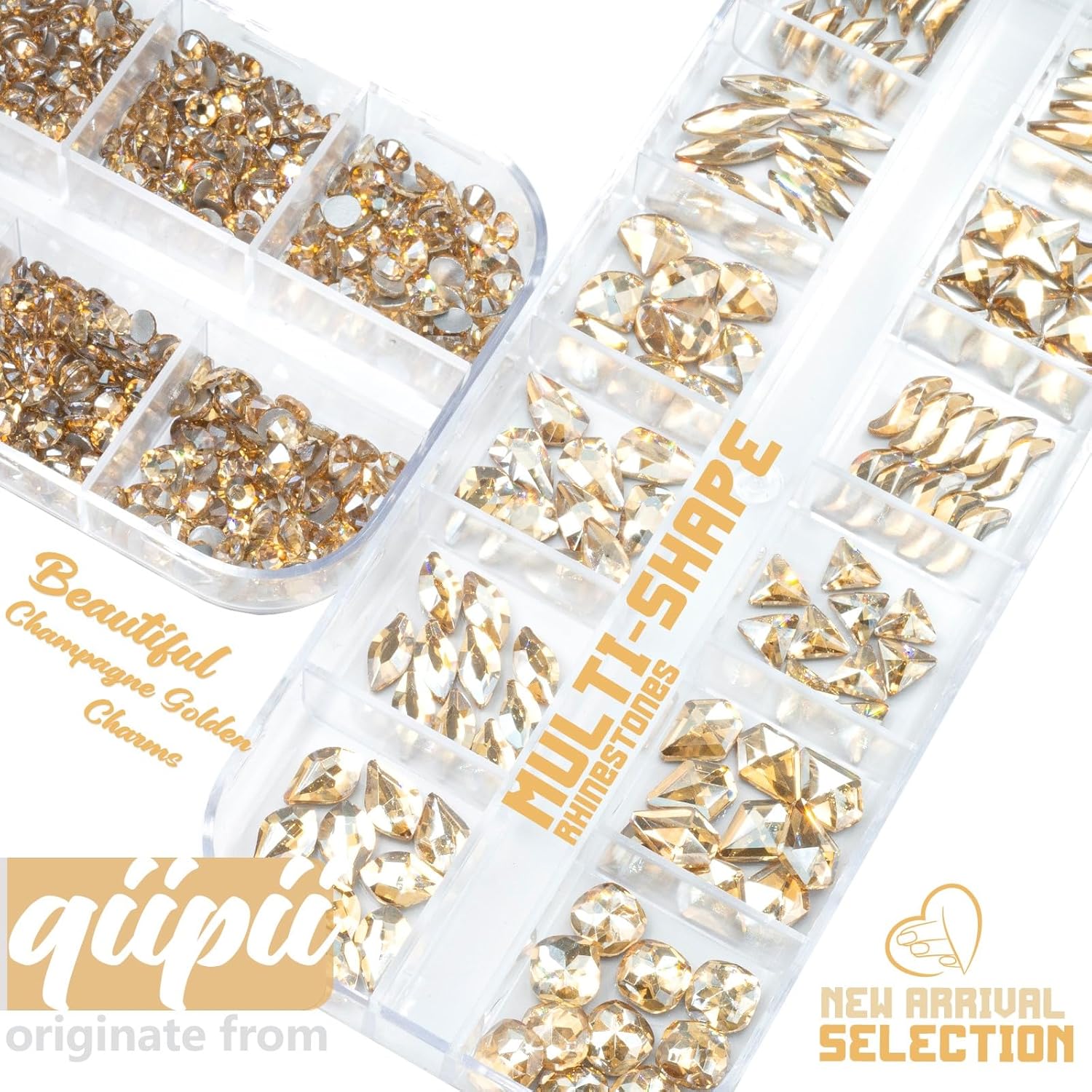 - ❤【2 Boxes 24 Grids Crystal Champagne Gold Nail Rhinestones + Stainless Steel Tweezer + Pickup Pen】qiipii 4080Pcs sparkling Champagne Gold rhinestones nail crystals. Including 120pcs multi-shaped crystal rhinestones, 3960pcs multi-sized round crystal gem rhinestones. Enough amounts and more shape options for your daily work, go out or other decoration purposes. Comes with 1 Stainless Steel Tweezer and Pickup Pen for Manicure DIY Decoration at Home Salon Supplies.