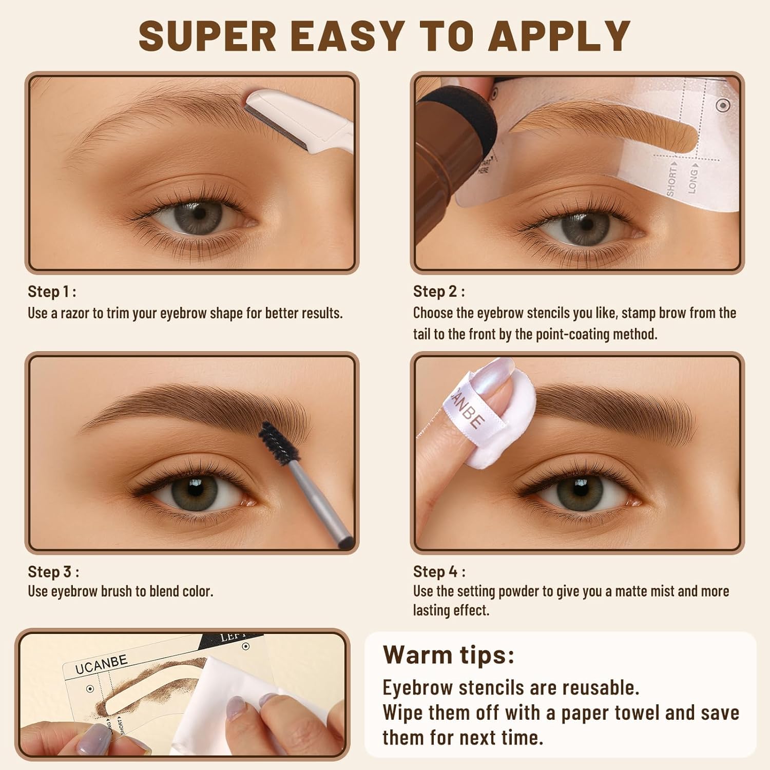 - For Thin & Thick Eyebrows: Well-chosen 10 pairs reusable eyebrow stencils follow the golden ratio principle to provide a range of shapes that perfectly fit all types of eyebrows. Whether you're looking for a natural or a bold eyebrow makeup look, UCANBE brow stamp kit has you covered!