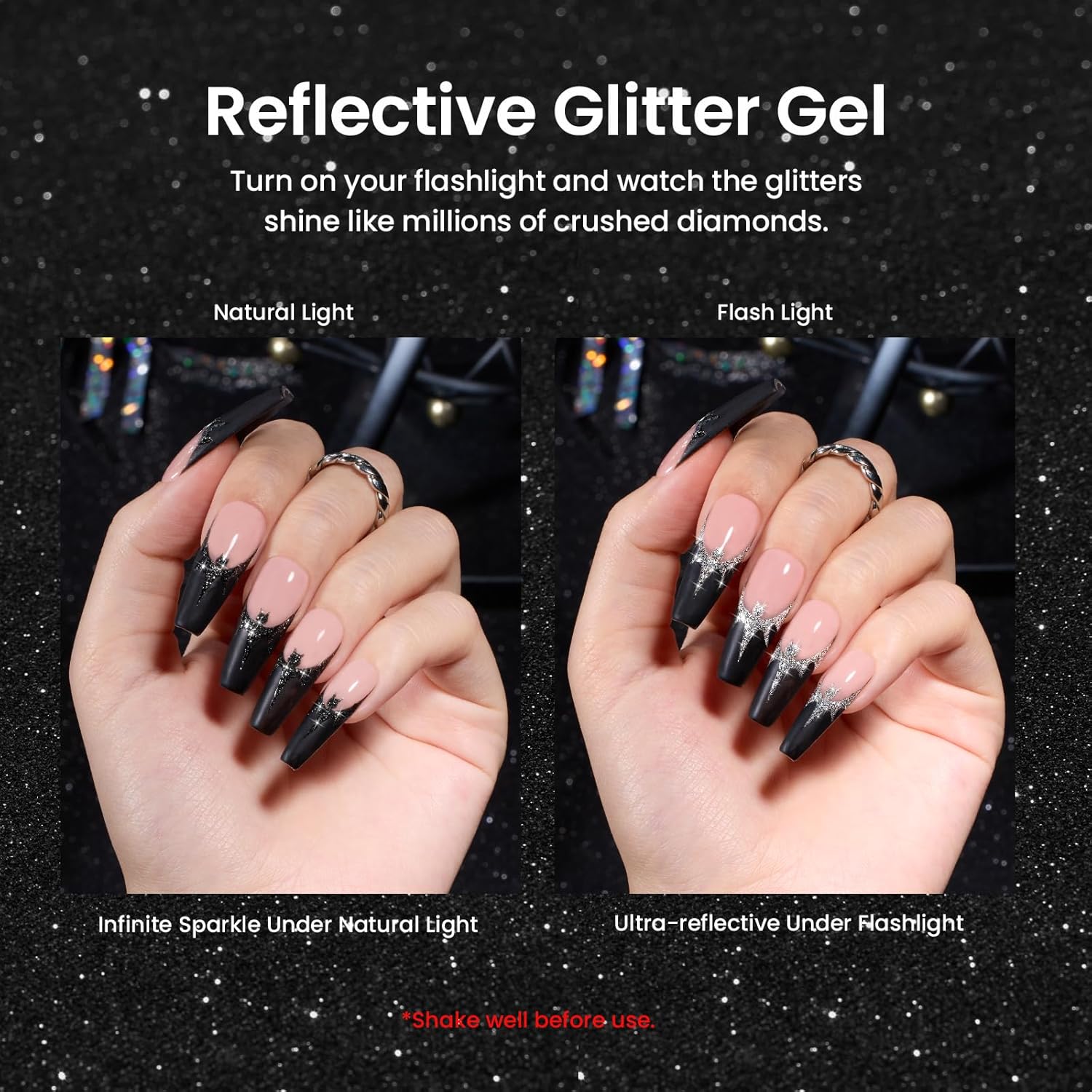 Beetles Reflective Glitter Gel Polish, 2 Pcs Liner Gel Nail Polish Set Black Silver Nail Art Gel Glitter Gel Nail Polish Diamond Shinning Liner Nail Art Design Gifts for Women New Trend