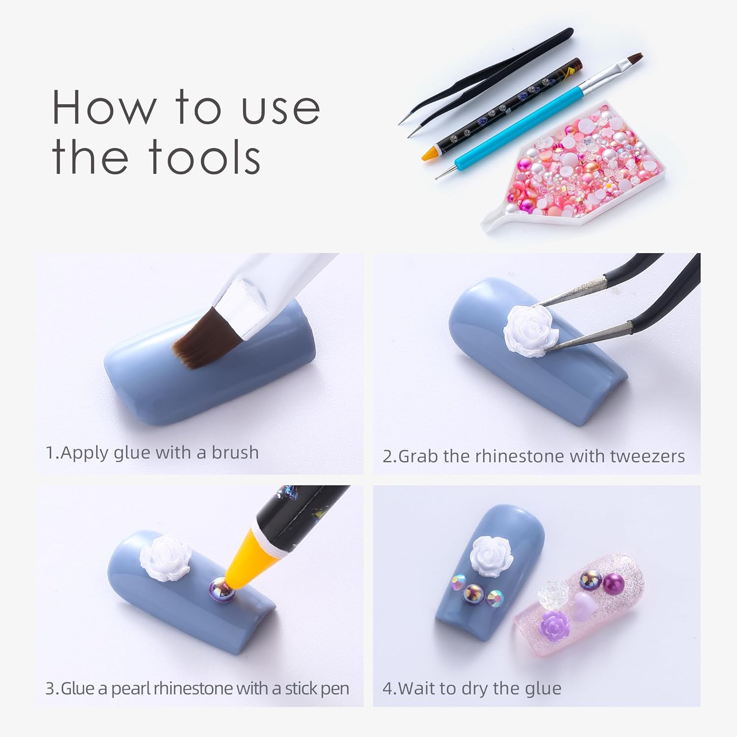 - Useful tools - These pearls and rhinestones have a flat back, which is excellent for easy placement.and you can pick up any large or small pearls and rhinestones with the crayons we bring along. And use the brush to smooth out the Gel, these tools will work very well