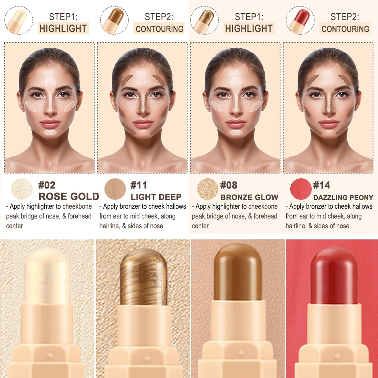 Face Cream Contour Stick Bronzer Stick Highlighter Stick Blush Stick Illuminator Makeup Glow Kit,Long Lasting Highly Piamented Skin Brighten Shadow Contour Bronzer Highlighter Blush Powder-A2