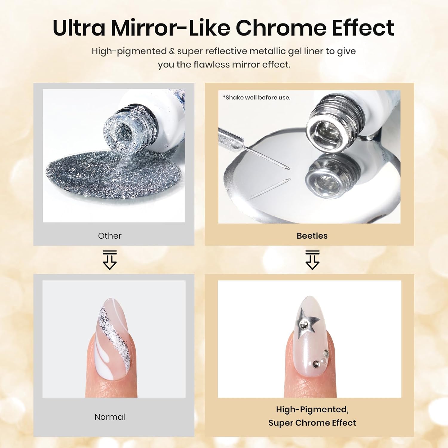 - Shiny metallic luster: Gold, Silver, and classic black-and-white vivid colors, rich colors, and high-saturation painting gel liner polish provide a mirror-like effect, giving nails a fashionable and futuristic look. The chrome effect reflects light and creates a high-gloss reflective surface on the nails.
