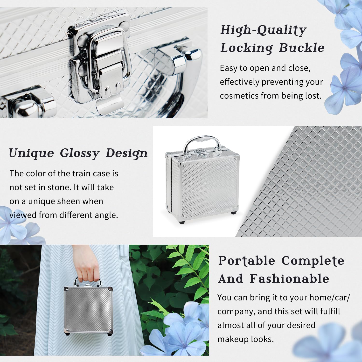 Color Nymph Beginner Makeup Kit For Teens With The Small Cosmetic Train Case Included 24-Colors Eyeshadow Palette Blushes Bronzer Highlighter Lipstick Brushes Mirror(Silver)