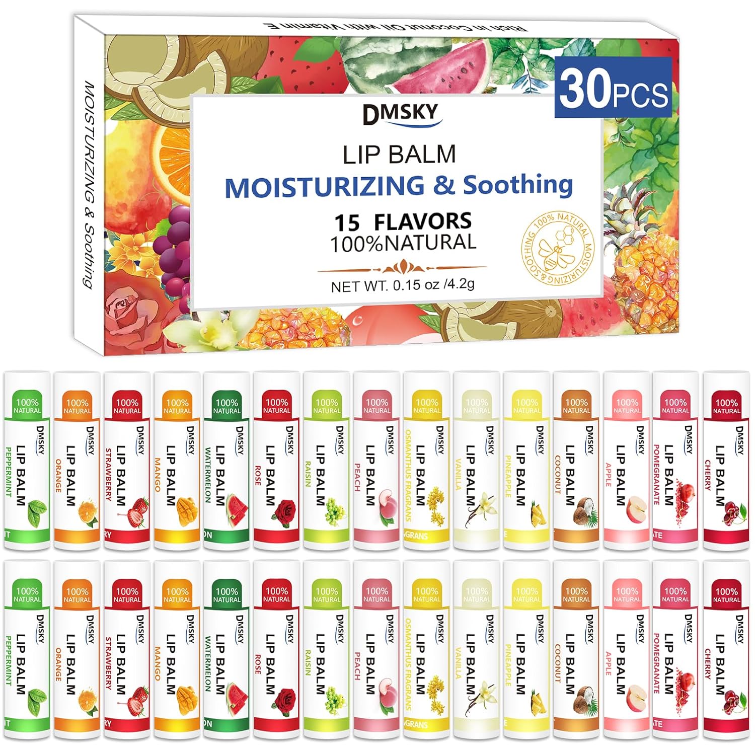 Dmsky DMSKY 30 Pack Lip Balm, Natural Lip Balm Bulk with Vitamin E and Coconut Oil 15 Flavors, Lip Care Product, Moisturizing Soothing Chapped Lips