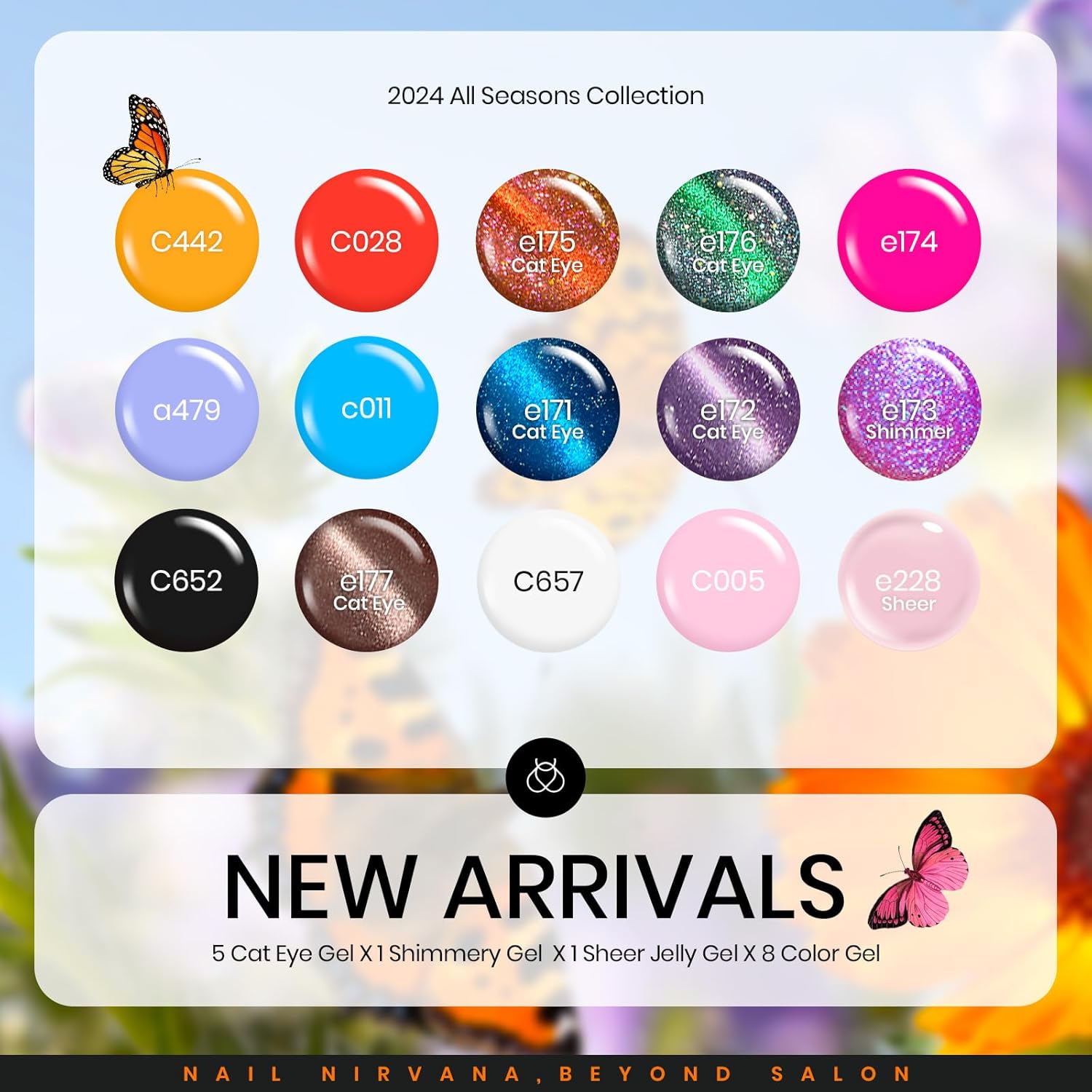 - ăWhat You Getă15 x Mini Gel Polish Colors (0.17oz/5ml each bottle) + 3 x No Wipe Base and Glossy & Matte Top Coat (0.25oz/7.5ml each bottle)+Color card*24 pcs+Medium Almond& Medium Coffin false nail tips*60 pcs+Double-headed magnet*1+Silicone mold kit*1+Tweezers*1+ Nail Art Jelly Strips*5+Paper card*1. 15 beautiful shades of popular and trendy colors suitable for all seasons and daily routine life! Color Numbers are: c442-c028-e175-e176-e174-a479-c011-e171-e172-e173-c652-e177-c657-c005-e228.