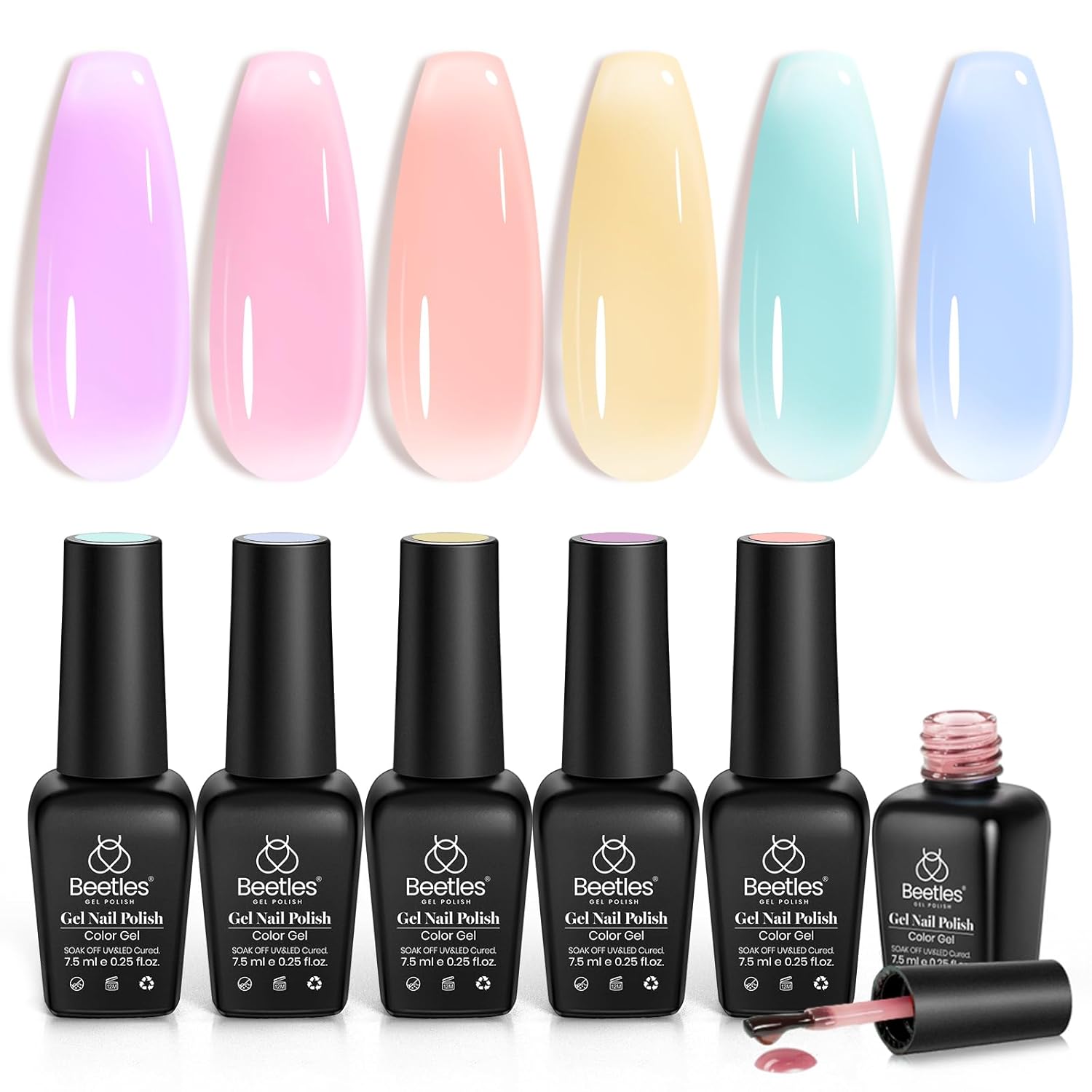 Beetles Pastel Gel Nail Polish Set, 6 Colors Jelly Gel Polish Kit Pink Blue Purple Orange Yellow Green Translucent Effect Soak Off UV Candy Sweet Collection French Nail Gift for Women