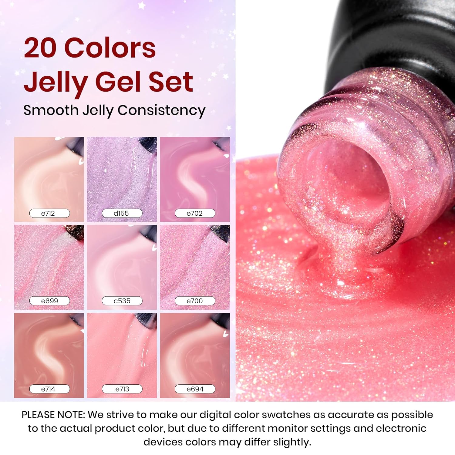 - ă20 Colors Jelly Gel Nail KităThis beetles gel nail polish set includes the top 20 trendiest colors glitter milky white nude pink jelly gel, 7.5ml*1 base coat, 7.5ml*2 glossy and matte top coat and 2*Pearls Rhinestones Nail Charms. This gorgeous jelly nail gel set is perfect for daily life or dating, Matching diamond and pearl accessories you will be the focus of the crowd, and will get a lot of compliments