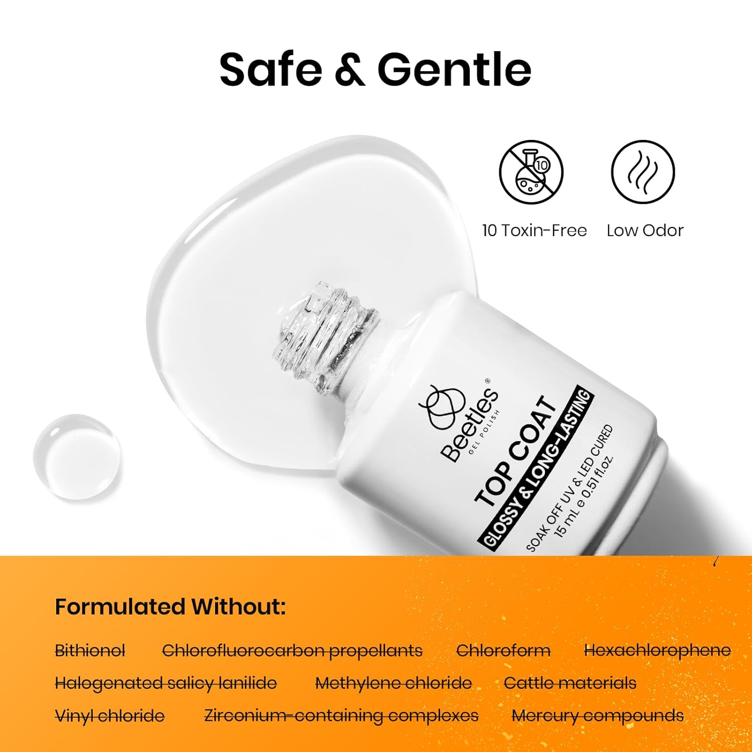 - Beetles Extra Glossy Top Coat: Compared with ordinary top coat gel nail polish, upgraded super shiny gel nail polish top coat is effective against stains, more abrasion-resistant, smoother, and able to resist scratches, leaving the nail surface smooth and looking brighter. UV/LED Lamp Needed, Tips: Avoid touching your nails after curing the top coat for 2 minutes to enhance the shine.