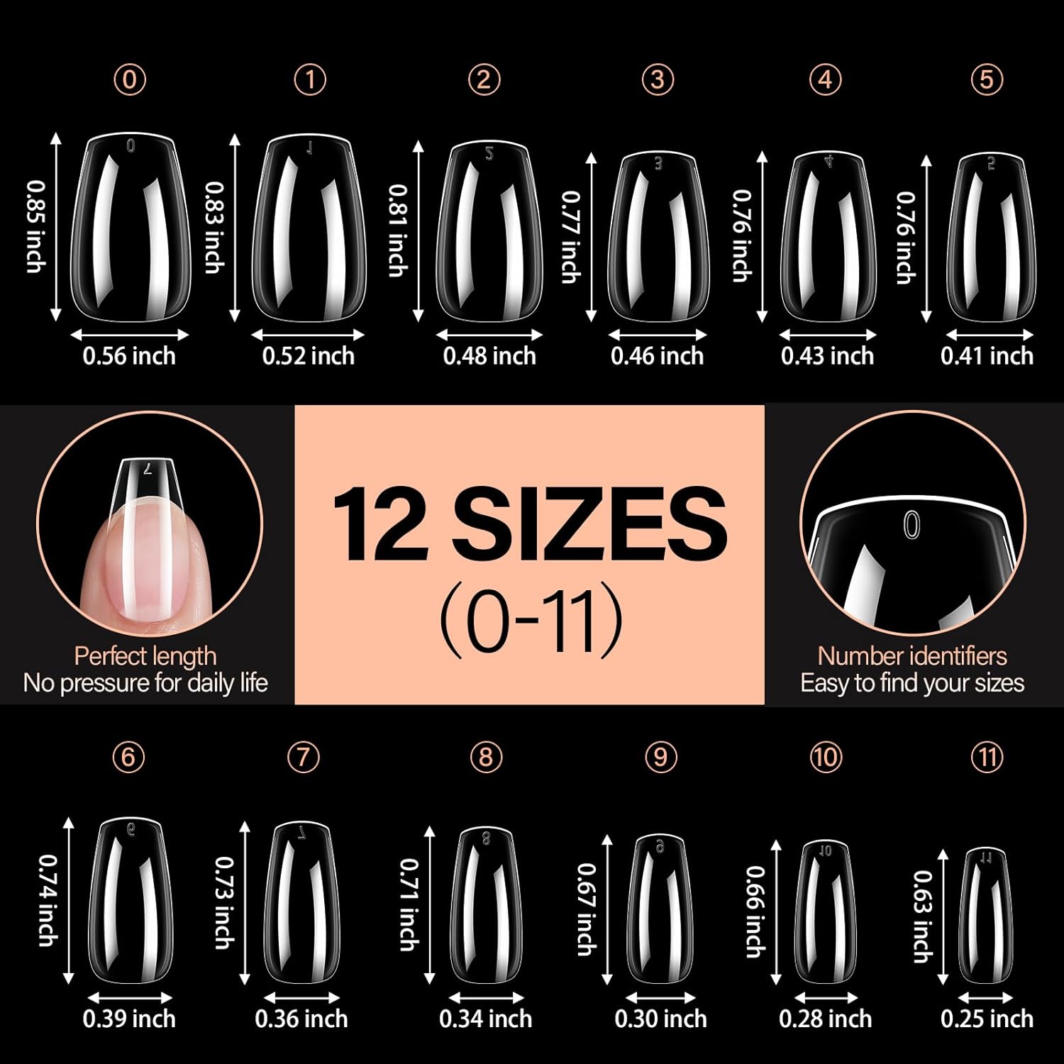 - Multiple Sizes Option: Our preshaped nail tips include 12 different sizes with each size 18pcs, totally 216pcs, providing you with more options to choose. For the extra sizes, they can be easily trimmed and shaped to suit your preferences, giving you the freedom to express your creativity, avoiding waste. Regarding the dispute about the length of full nail tips, everyone’s nail bed length is different. It is recommended to refer to the size chart when purchasing.