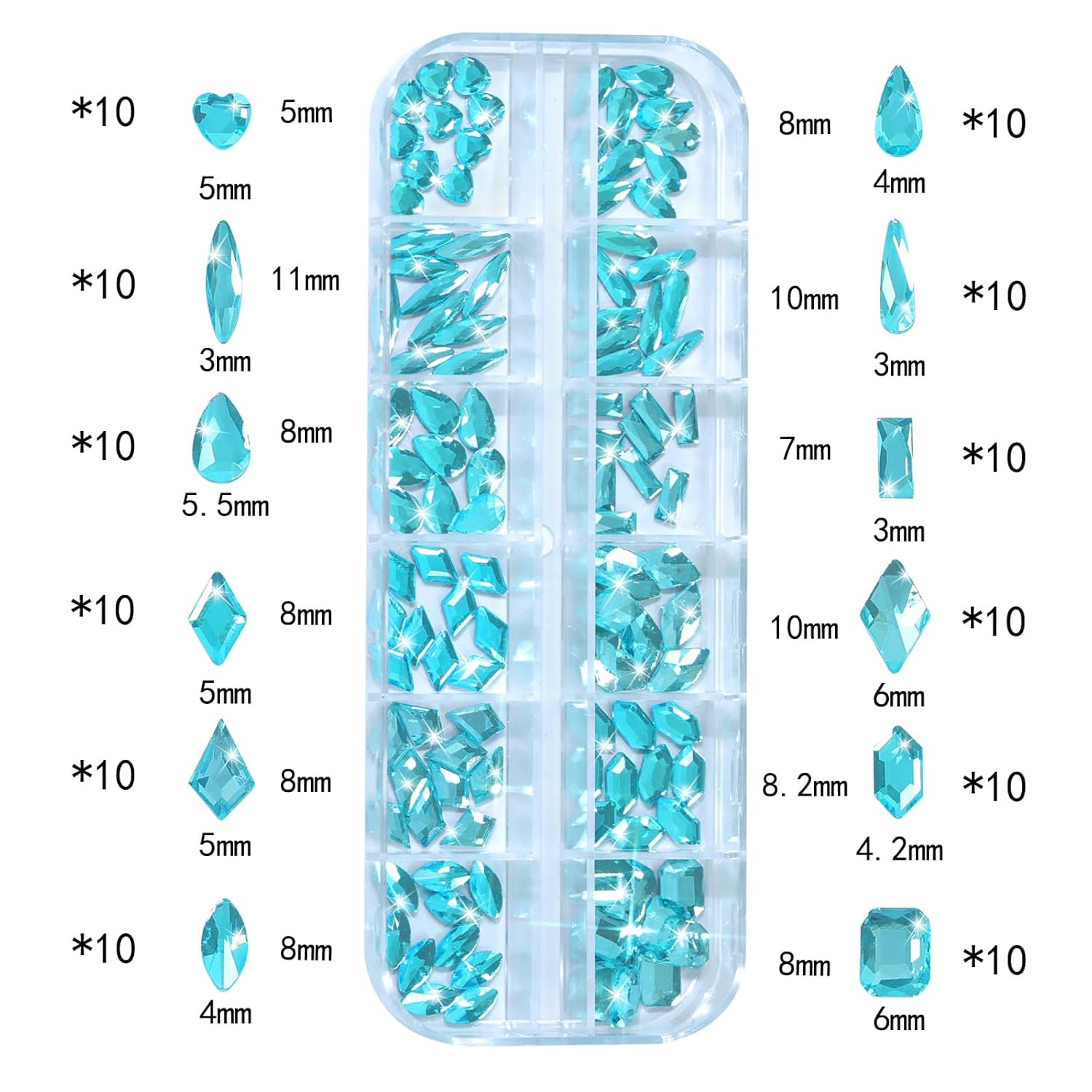 HNUIX Nail Rhinestones - 3D Multi Shape Size Crystal, Aquamarine Nail Gems, Flat Back, with Kit, for Nail Art, DIY Decorations