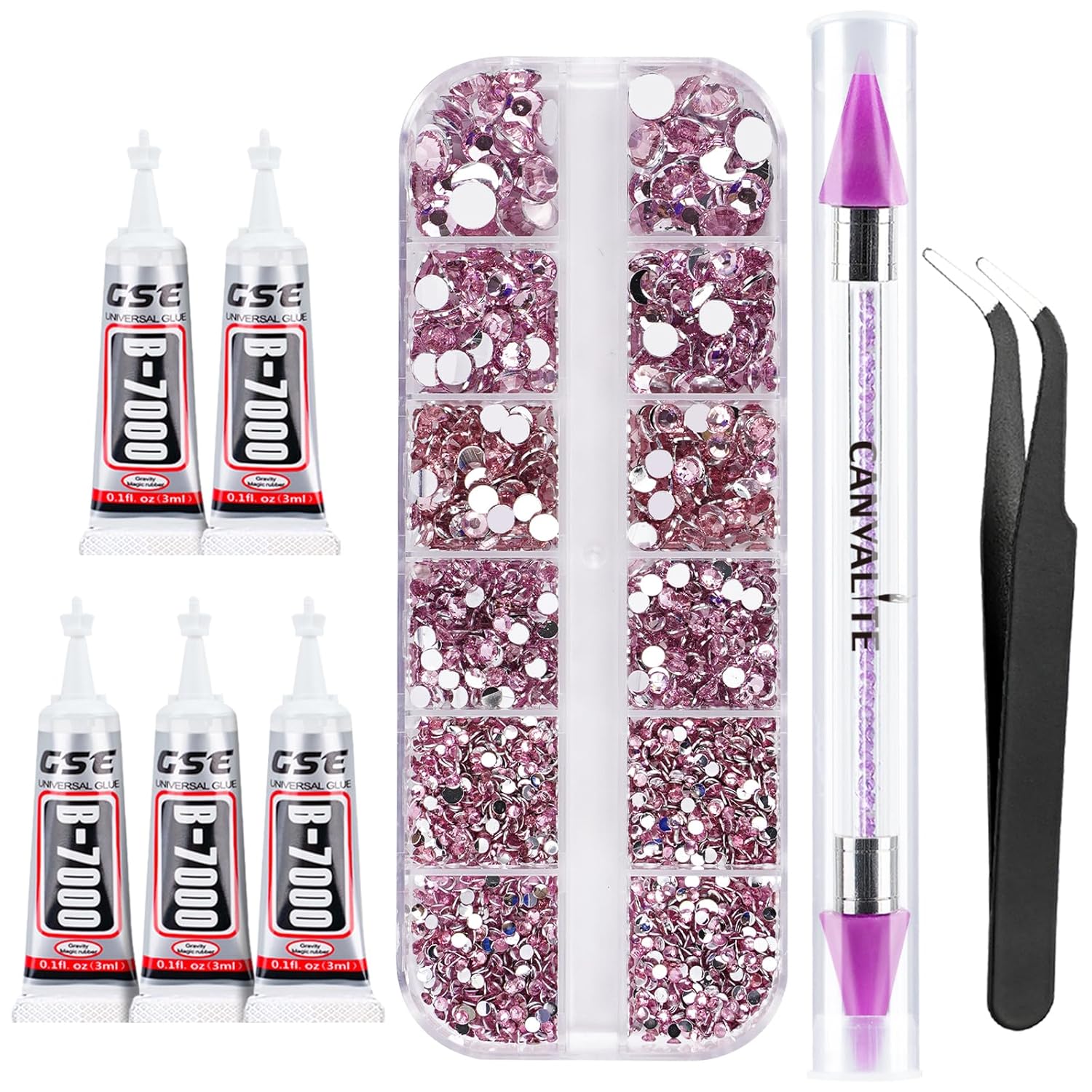 Canvalite 2784Pcs Pink Rhinestones Nail Art Gems with Tools, Flat Back Matte, Plastic, Nail Art, Rhinestones, Tweezer, Double Point Dotting Pen, 5Pcs Jewelry Glues