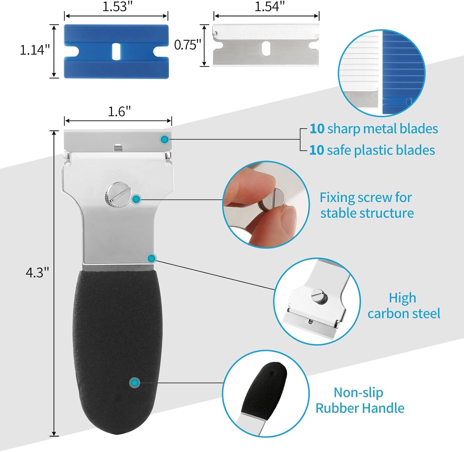 - PREMIUM MATERIAL: Crafted for comfort and control, the scraper features a non-slip rubber handle, ensuring a comfortable grip. The body is made from high-strength steel alloy, while the metal blades are crafted from high-carbon steel and the plastic blades from premium injection-molded material. Sturdy, they are built to withstand use without deformation or breakage.