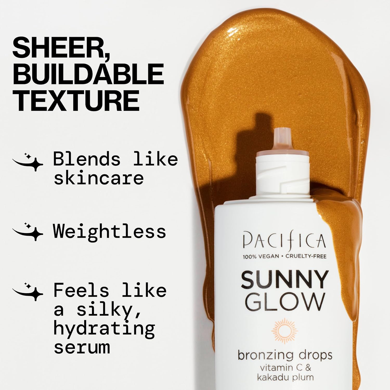 - Clean, Vegan Beauty Elixir: Pacificaâs Sunny Glow Bronzing Drops are 100% vegan and cruelty-free, formulated without parabens, phthalates, or mineral oil. The nourishing formula includes plant-based ingredients like extracts from fruits and flowers to benefit your skin. Because itâs a liquid bronzer with skincare-grade ingredients, you wonât clog pores or cause breakouts. Achieve a radiant bronzed look while hydrating and treating your skin with clean, ethical ingredients. Itâs summer in a bottle, suitable for all skin tones, with zero sun exposure required.