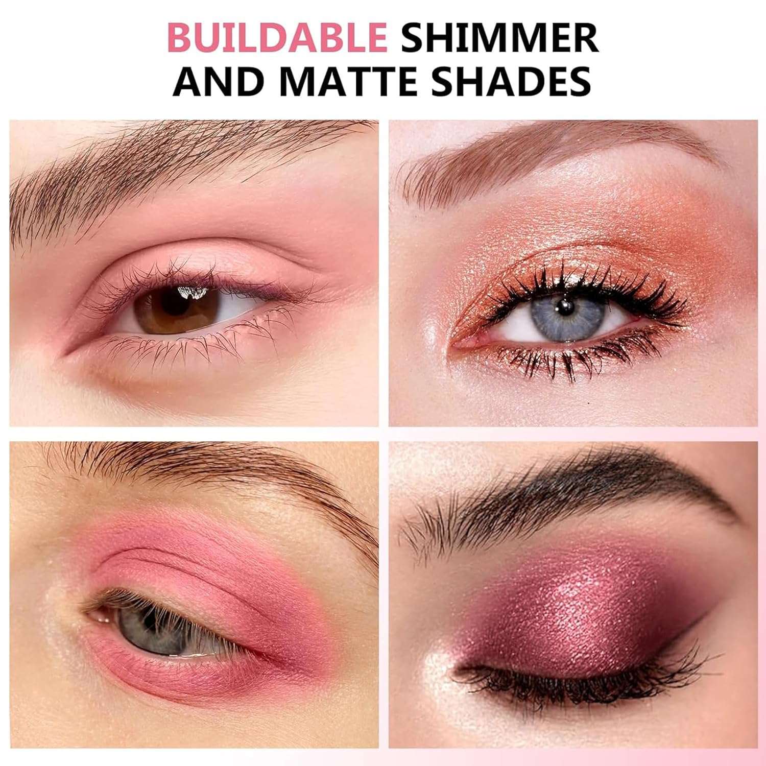 - Buildable - Matte and shimmer shades are easy to layer and blend. Layering high-shine glittery colors on top of matte base adds a dreamy, sexy effect to your eye makeup, giving you a more vibrant appearance.