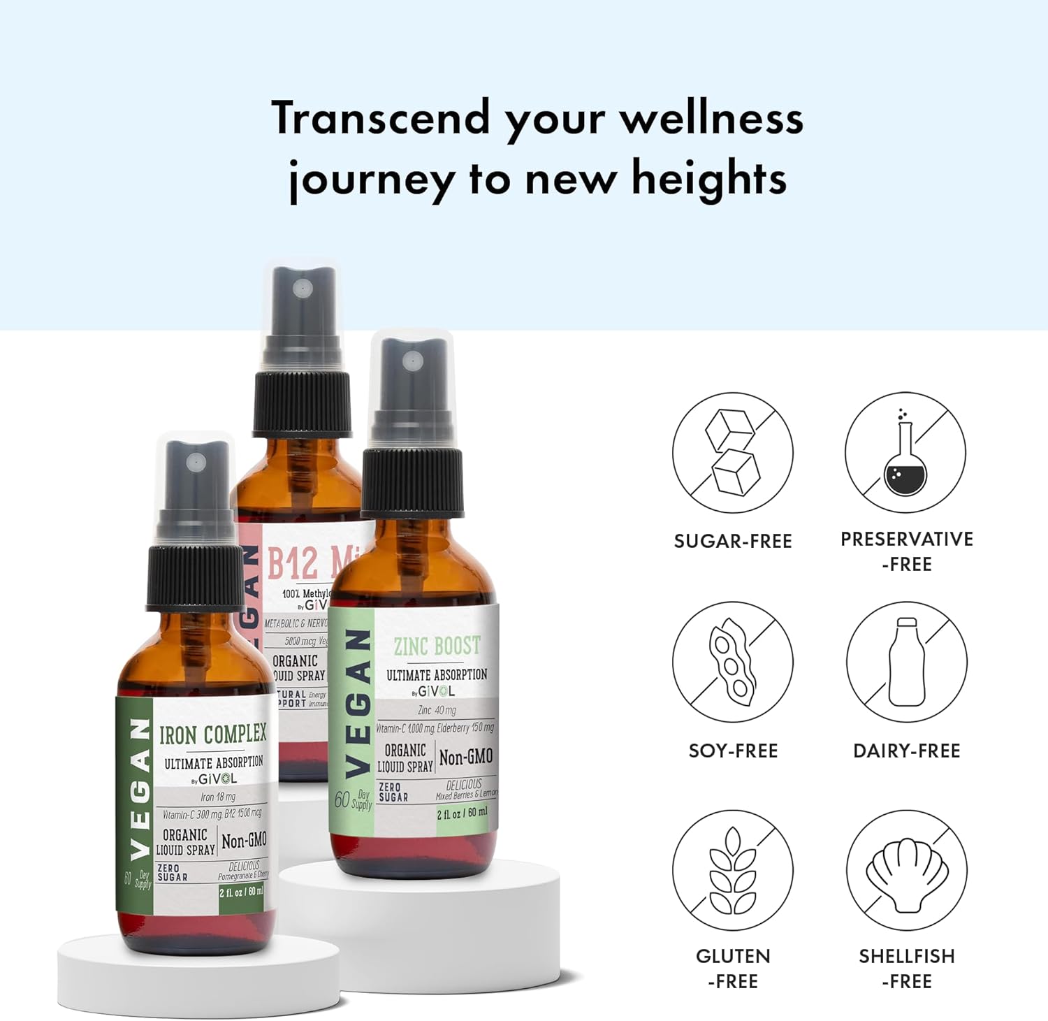 Iron Support Spray Bundle Liquid Vitamin B12 Methylcobalamin, Zinc Picolinate, and Bisglycinate | Non-GMO, Gluten-Free, Sugar-Free Iron Supplement | 2 Fl Oz Each | 360 Days Supply
