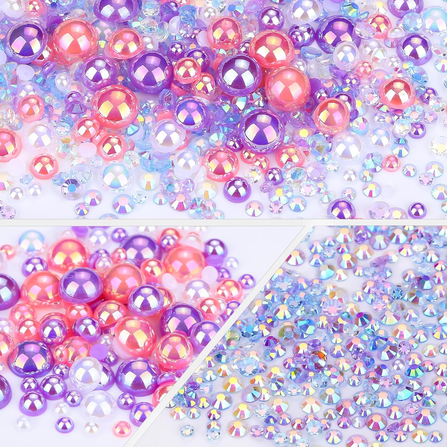 60g Pink White Flat Back Pearls Rhinestones for Crafts Mixed Size 3mm-10mm AB Color Round Half Pearls Flatback Pearl Beads and Resin Rhinestones Set for Face Art