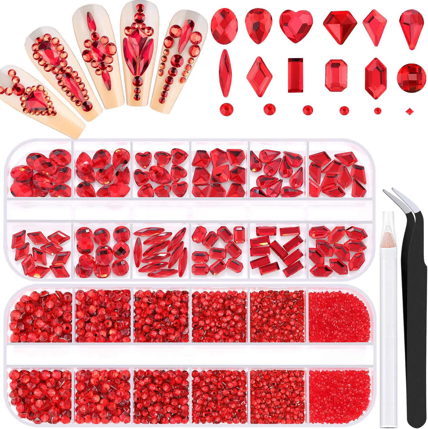 - 💎PACKAGE CONTENT -- The package contains 120Pcs multi shapes flatback gems crystal and 2510Pcs 1.5-4mm round beads, totally 2630Pcs Red rhinestones. Additionally, 1 tweezers for large size gems and 1 pickup pen for small size gems. This rhinestones kit makes it easy for you to make any nail art you like, and will bedazzle your acrylic nails!